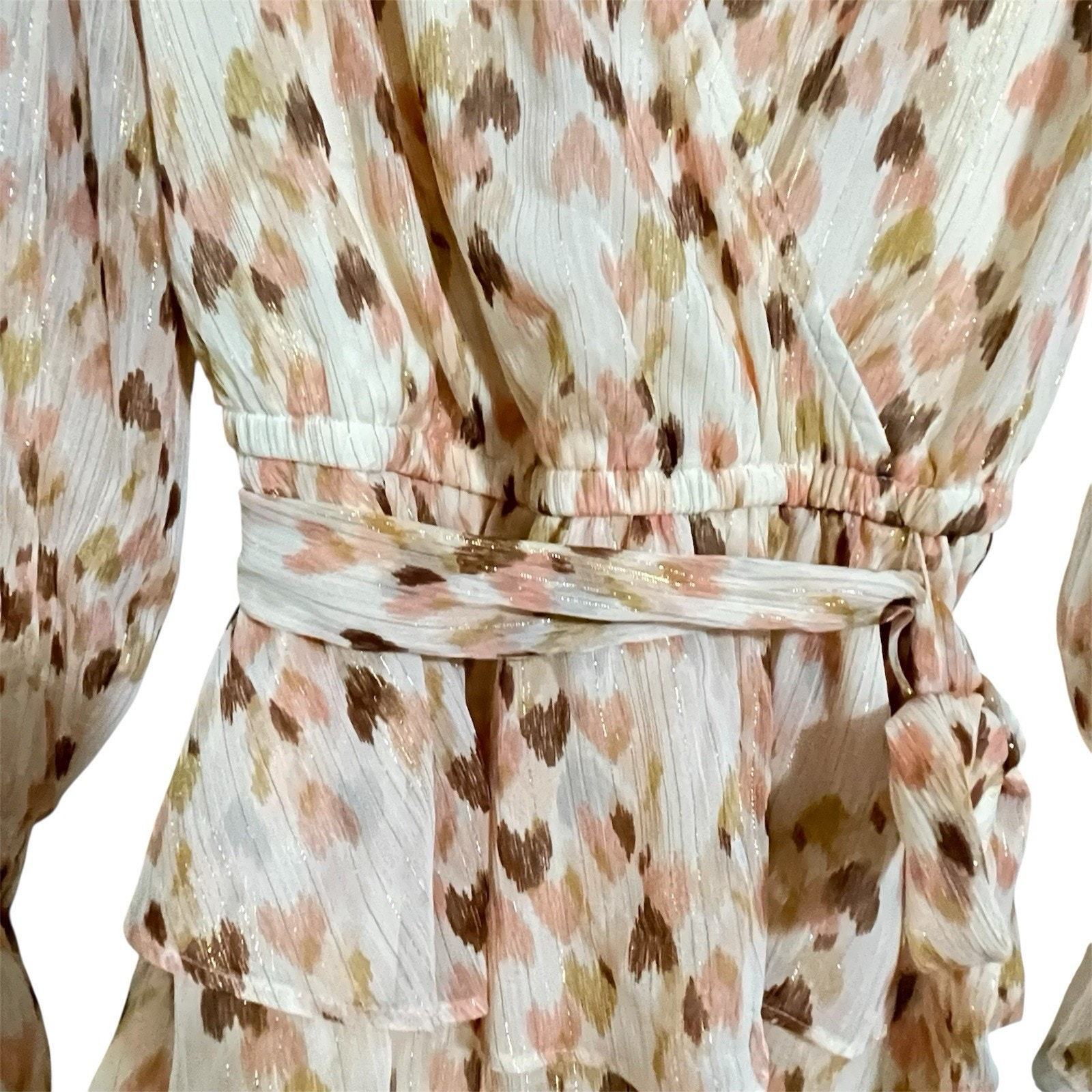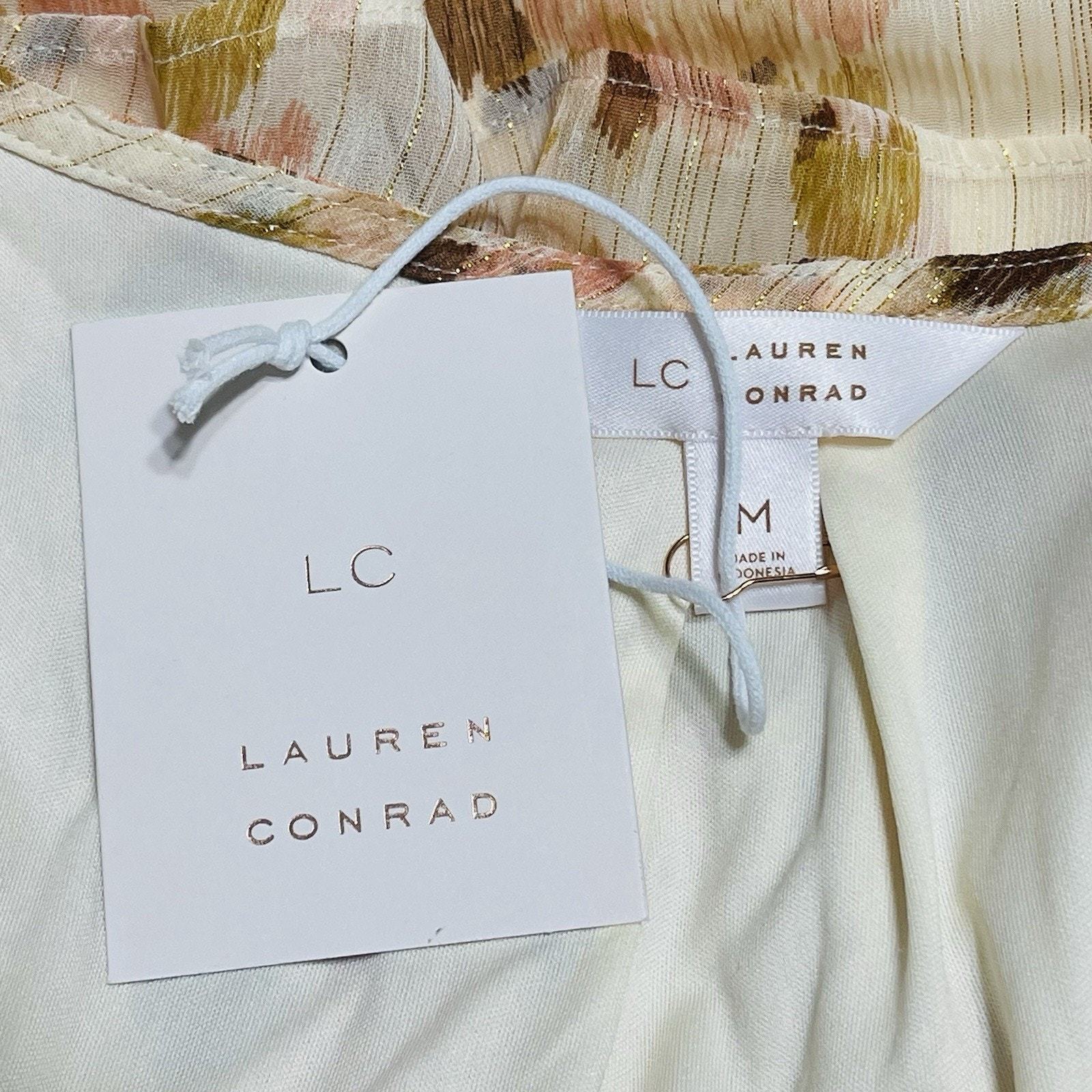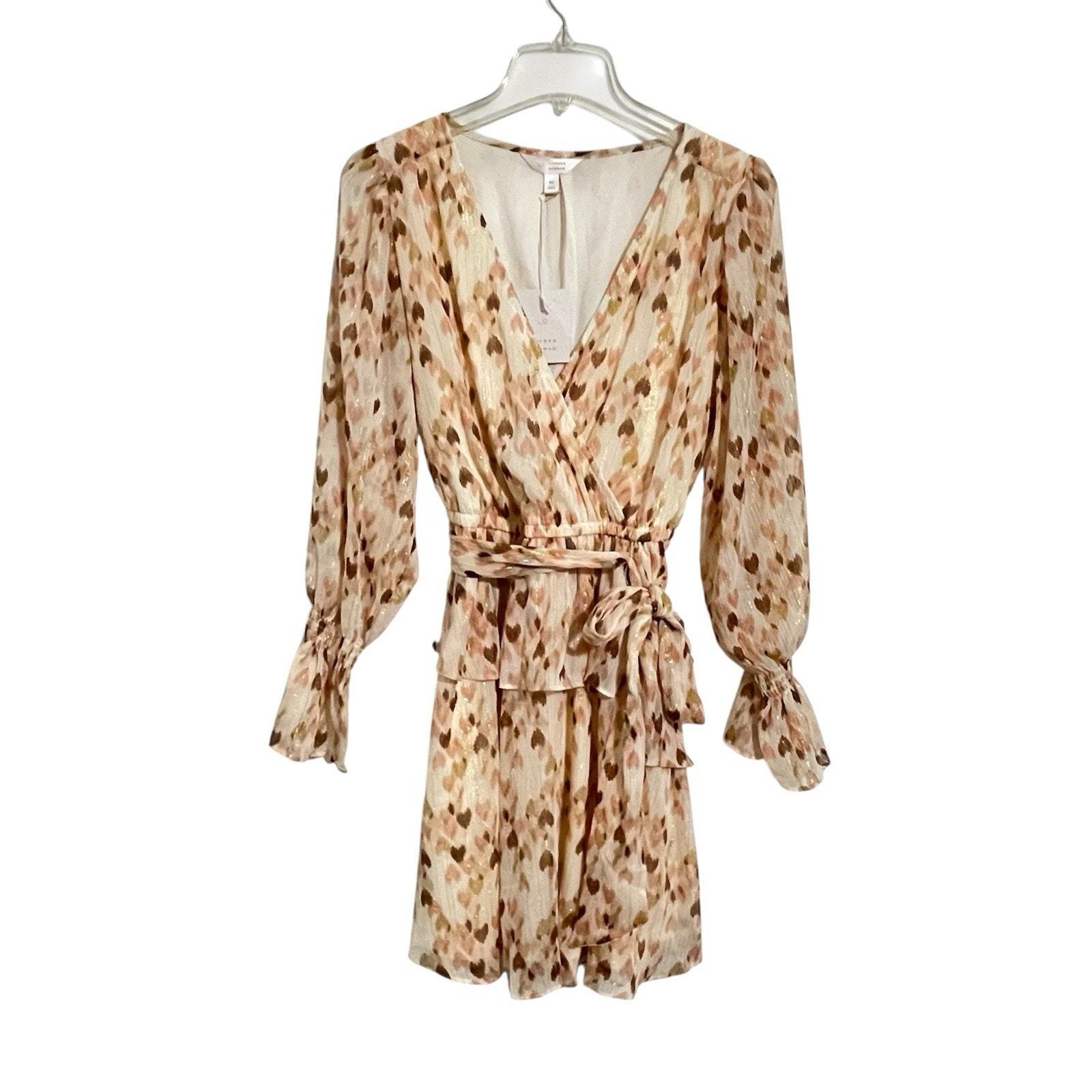 LC Lauren Conrad Peplum Waist Faux Wrap Mini Dress Size M Peach Beige Gold NWT
