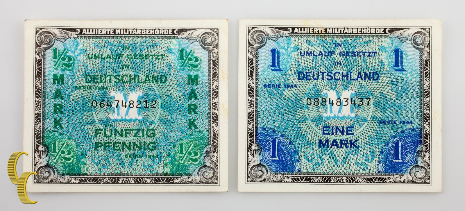 1944 Allemagne Allied Occupation Envoie WWII 2 PC Note Lot 1, 1/2 Mark (au-Unc)