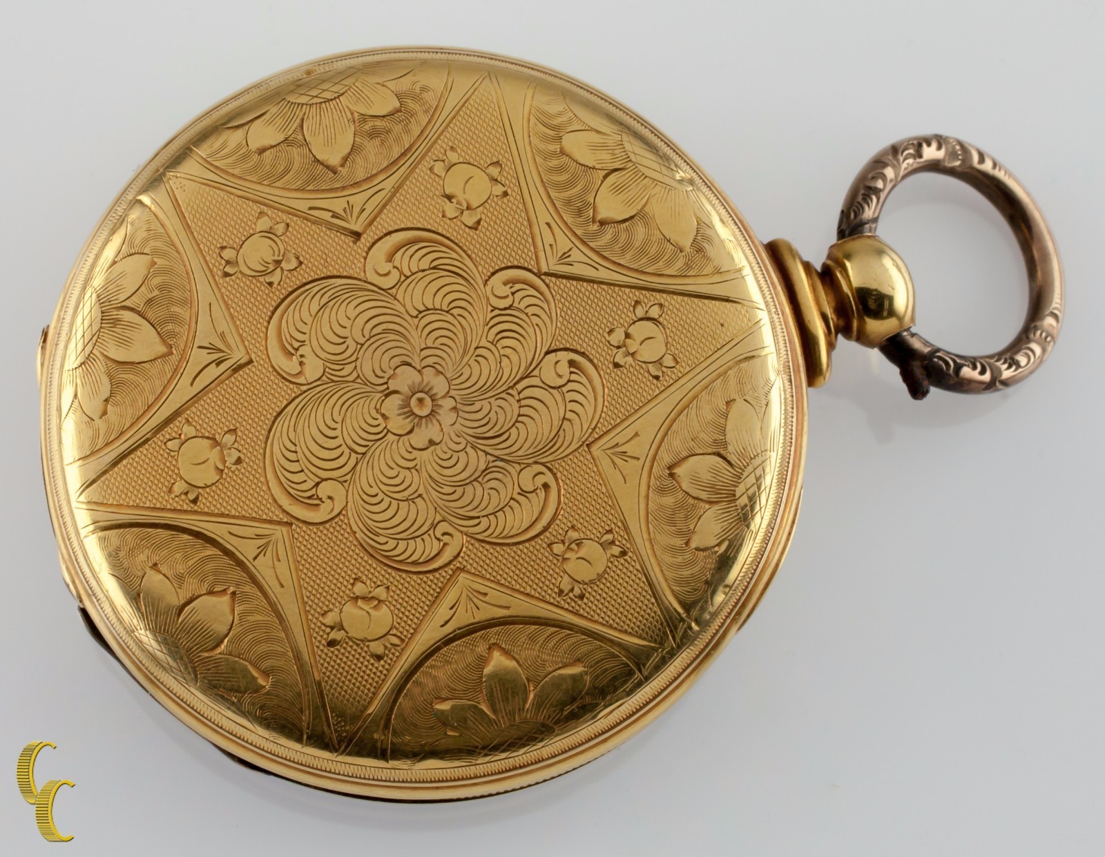 Caso de oro solido amarillo de 18k con diseño intrincado de plumas en el reverso de la caja