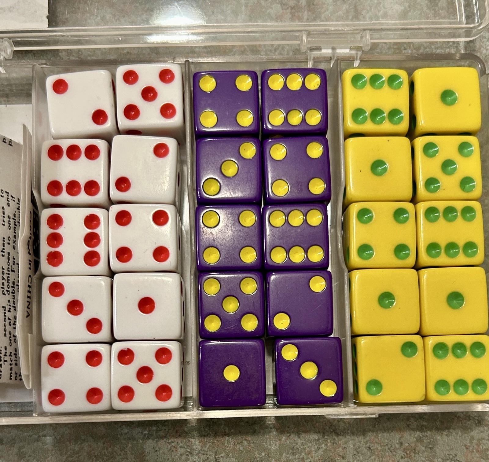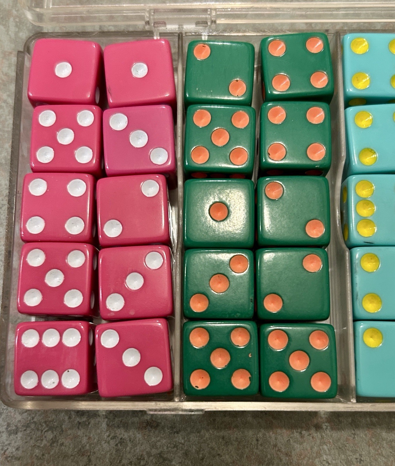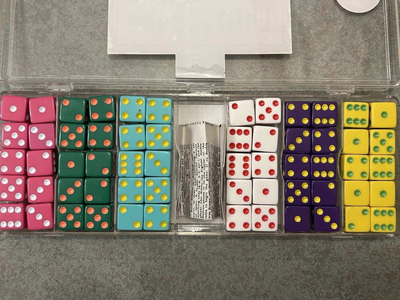 ? Includes: 100 dice in 10 matching sets of 10 (6 different colors), original storage case, instructions