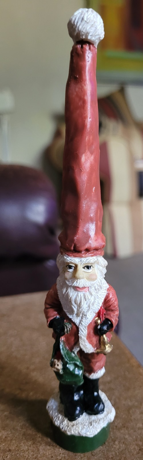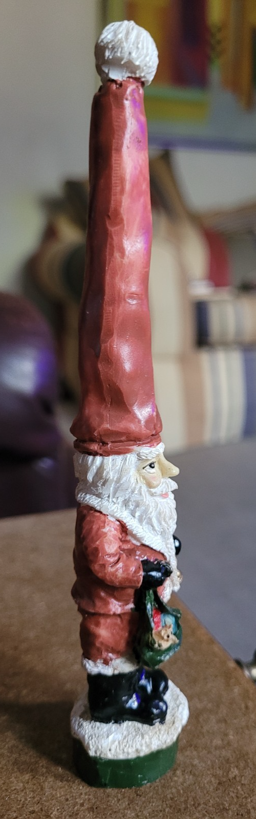 This tabletop Santa is in good used condition. There are no chips or cracks that I found. It measures approximately 6 inches tall.