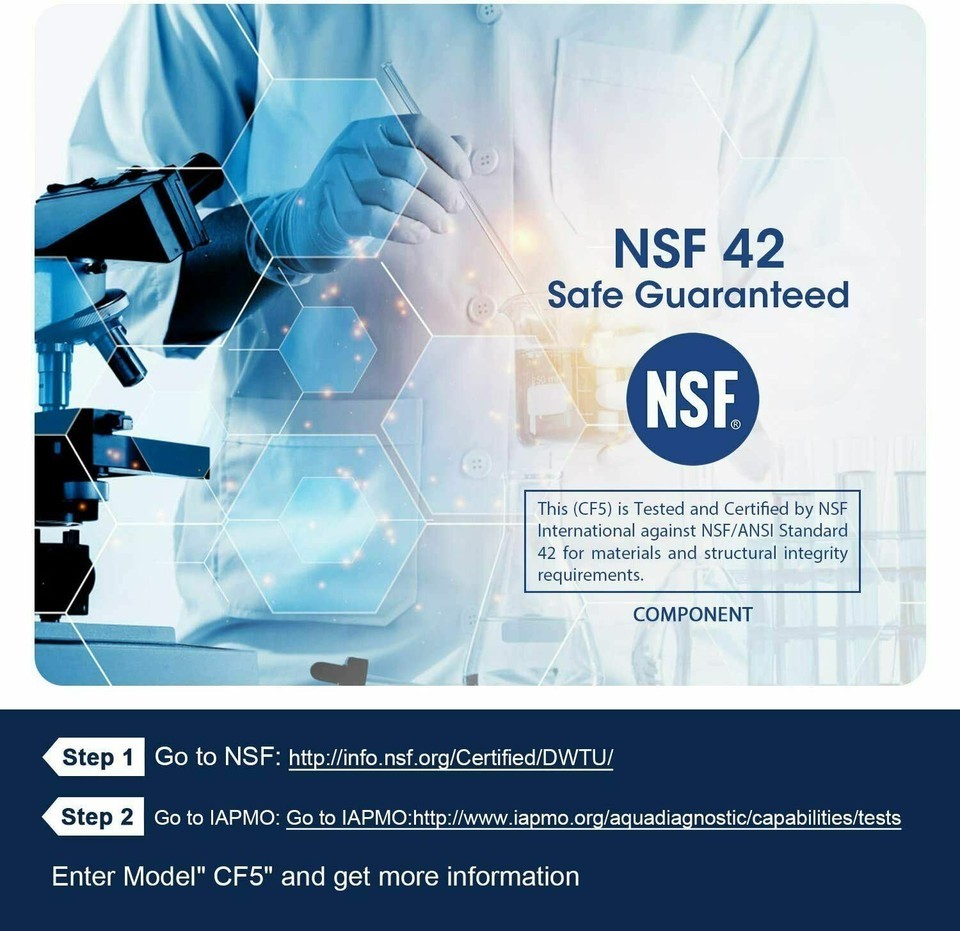 Crystala Filters Statement: The materials and construction are in compliance with the NSF 42 standard. CF5 whirlpool refrigerator water filter is tested to remove 97.9% chlorine, bad taste and odor, sediments, rust and turbidity, improving the drinking water taste. Enter ?CF5? in the Brand Name/Model Field at NSF International (http://info.nsf.org/Certified/DWTU/) to find NSF 42 Standard information.