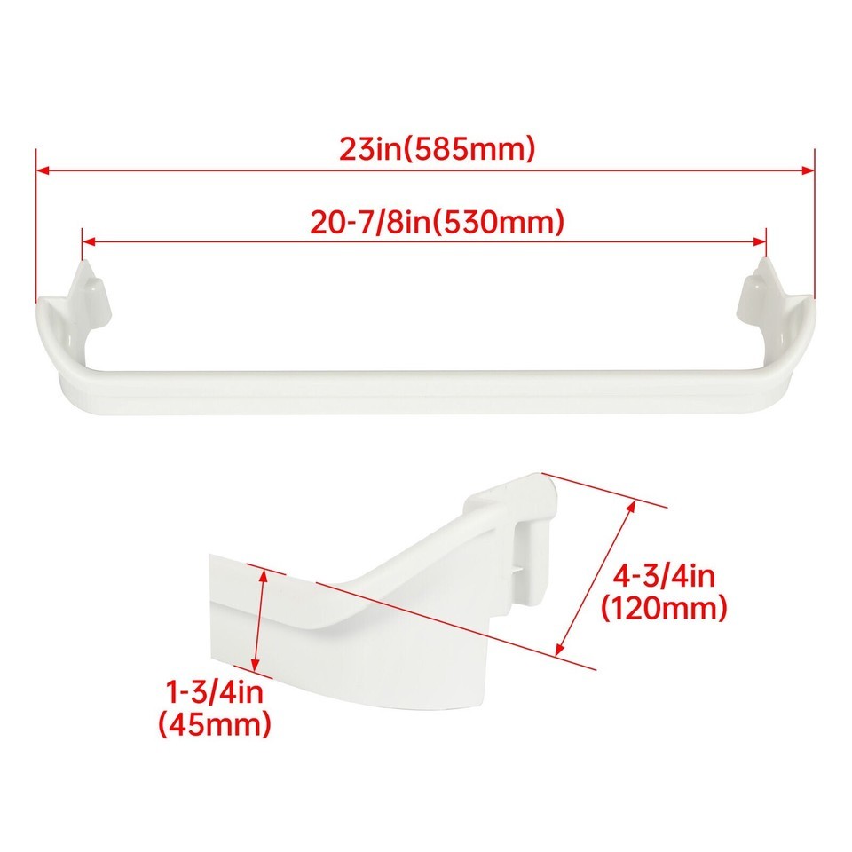 This Door Rack is a replacement part that is compatible with Frigidaire refrigerator models. Crafted from durable materials and designed to seamlessly integrate with your existing fridge. This rack is white in color and measures about 23 inches wide by 3 inches high by 5 inches deep.