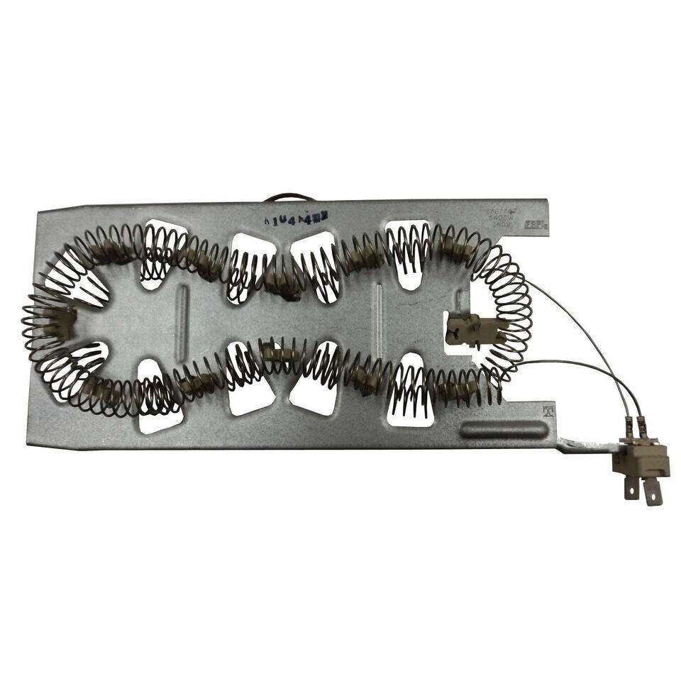This Dryer Heating Element Assembly is an Exact REPLACEMENT Part replacement part that is designed to fit late-model Whirlpool, Kenmore, Estate, and Roper electric dryers. The assembly includes a metal frame, metal element coil, and ceramic coil insulators.