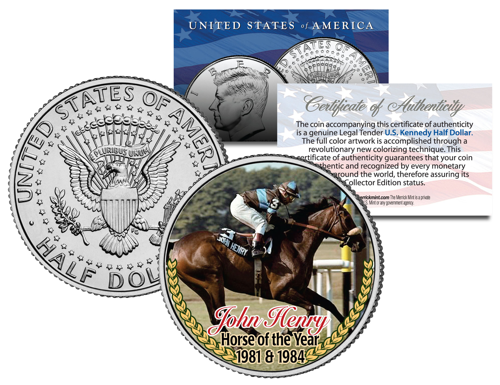 Here is your opportunity to own or gift the ?JOHN HENRY ? HORSE OF THE YEAR 1981 1984? colorized JFK Kennedy Half Dollar U.S. Coin, which has been enhanced with a beautifully colorized image by the Merrick Mint. Each coin comes in a premium coin capsule with a full color Certificate of Authenticity to guarantee that your coin is authentic and recognized by every monetary authority around the world, assuring its Collector Edition status. This Legal Tender United States coin has been colorized with an application of special inks directly to the surface of the coin, using a unique and painstakingly multicolor coin process, which achieves a level of detail, color saturation, and durability that is #1 in the coin industry. The result is an everlasting colorized coin collectible of ultra-high quality. The Kennedy half dollar is a U.S. fifty cent coin with coin year and mint marks chosen at random.