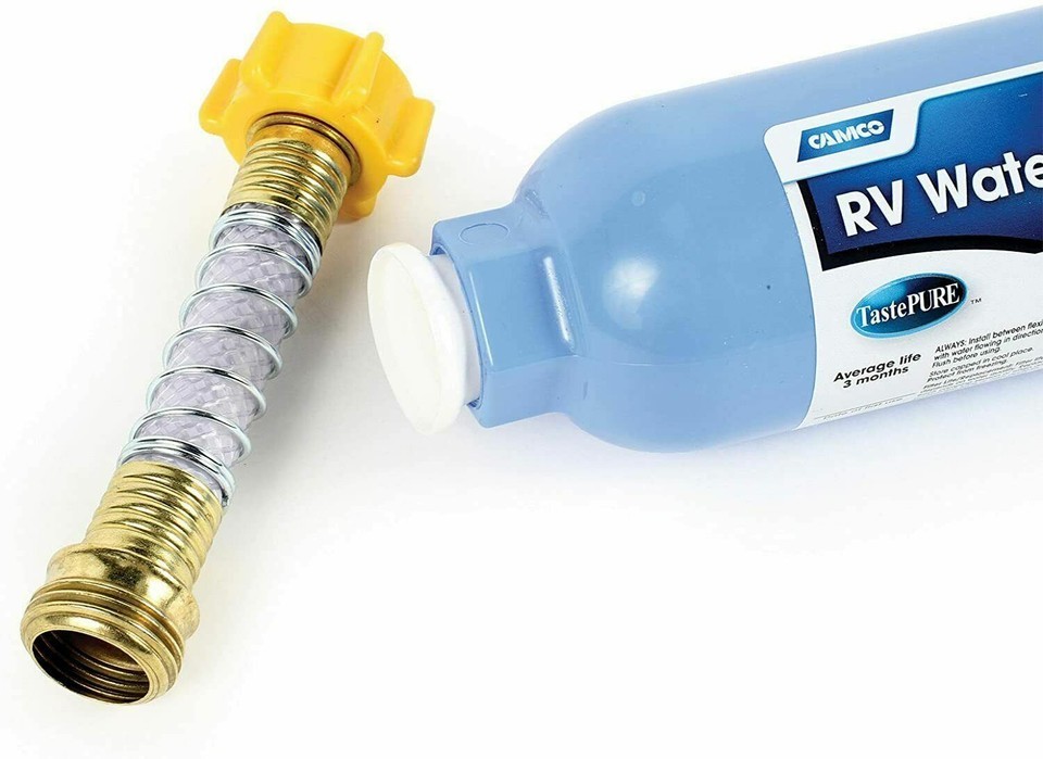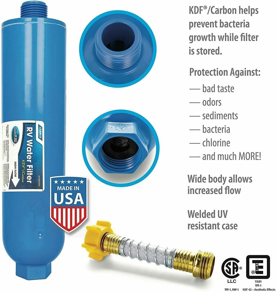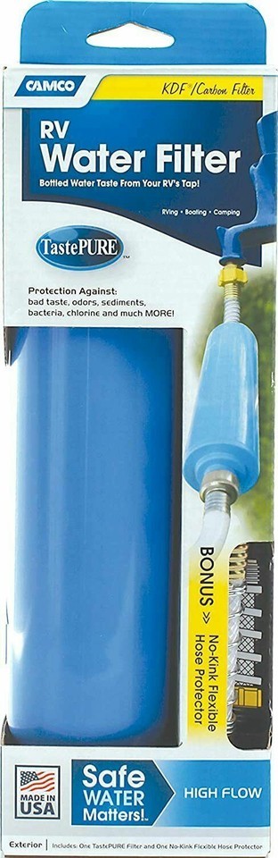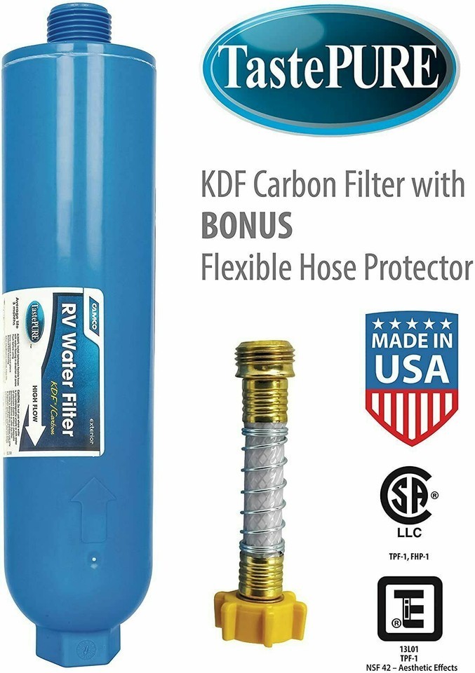 Camco?s TastePURE RV/Marine Water Filter with Flexible Hose Protector reduces bad taste, odor, chlorine and sediment in drinking water with a 20 micron sediment filter. Also features GAC (Granular Activated Carbon) filtration in combination with KDF to prevent undesirable bacteria growth when the filter is not is use. Durable in line, exterior mount filter has a wide body for increased flow. Includes a flexible hose protector to reduce strain on connections while minimizing kinking that could impede water flow. Not designed or tested with fish tanks or ponds. NSF 42/53 listed. CSA LLC (Low Lead Content) certified. Made in the USA.