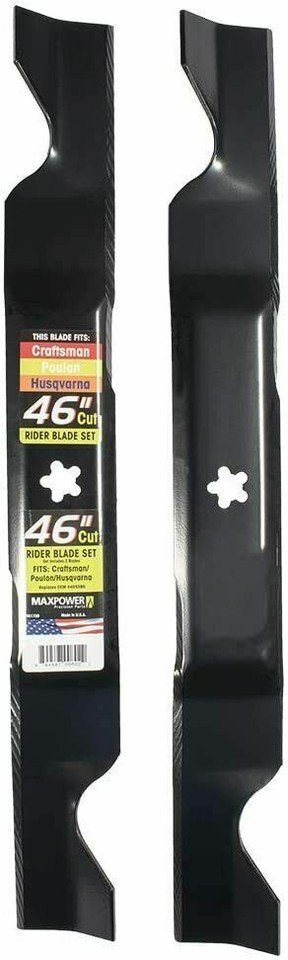 MaxPower 561739B 2-blade set for a 46" Cut Craftsman/Husqvarna/Poulan replaces 405380, 532-405380 and PP21011. Each blade measures 23" long by 2-3/4" wide and features a 5 pt. star center hole. MaxPower blades are proudly manufactured in the USA to meet or exceed OEM specifications. **Proposition 65 does not apply to this product!