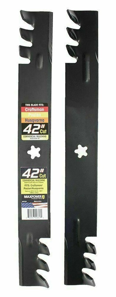 NEW 21" used on 42" decks. Has a 5 point star hole and will mulch. Mulching results will improve considerably if used with the plastic mulch plate that covers the discharge hole. This blade can also be used with a bagger, provides slightly better lift than the original blade that came with the mower.