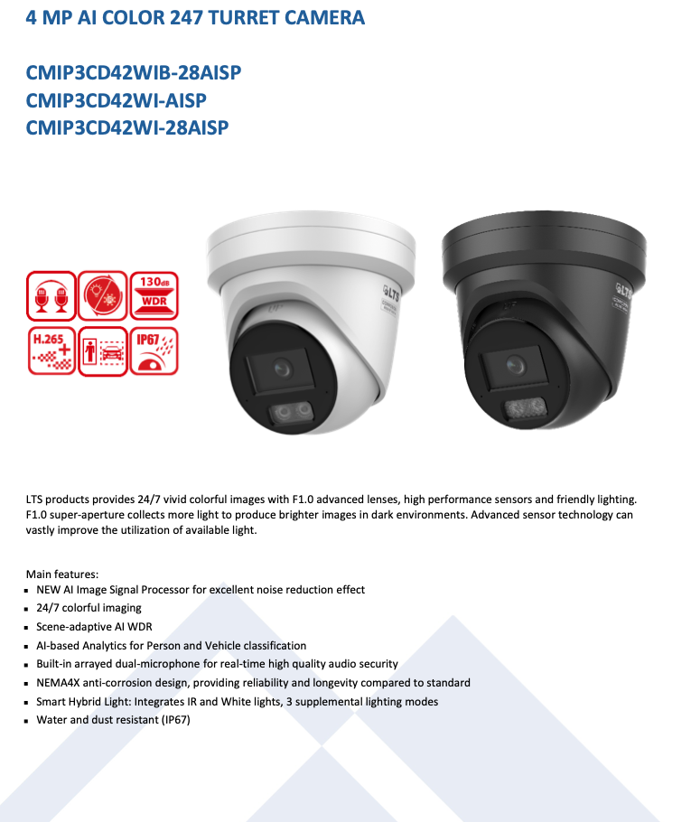 LTS products provide 24/7 vivid colorful images with F1.0 advanced lenses, high-performance sensors , and friendly lighting. F1.0 super-aperture collects more light to produce brighter images in dark environments. Advanced sensor technology can vastly improve the utilization of available light.