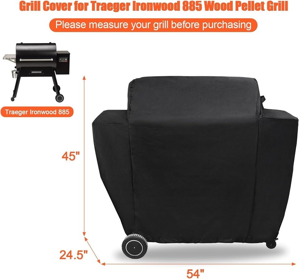 ?Perfect Fits? Measures 54" width by 24.5" depth and 45" height. Fits for Traeger 885 Ironwood Pellet Grill, Pellet Grill BAC513 Heavy Duty Smoker Cover.