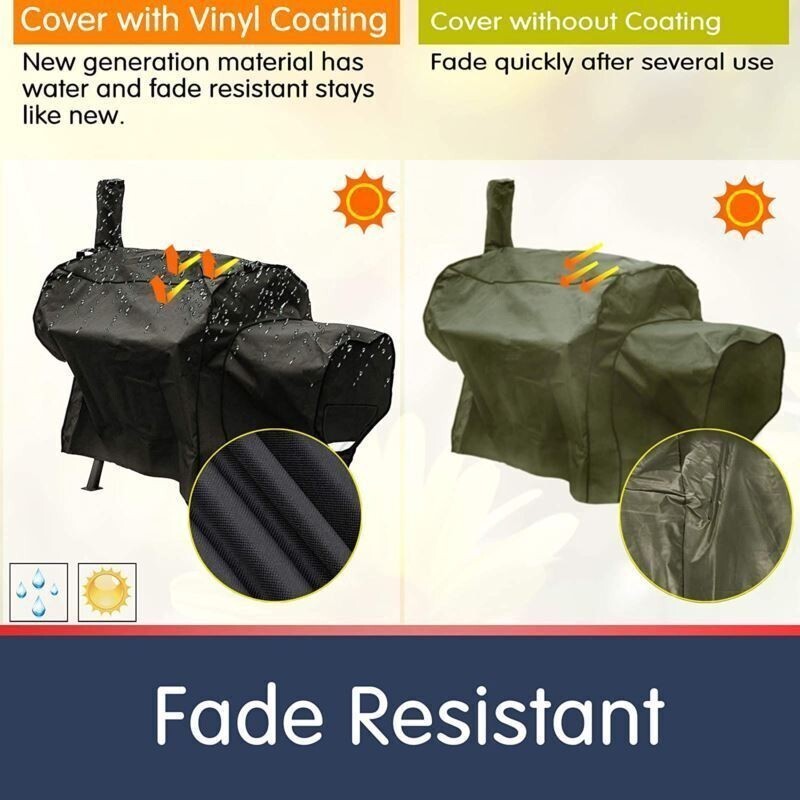 ??Fade Resistant and Durable Material?- Made of special fade resistant fabric, 600D heavy duty polyester and waterproof polyvinyl coating inside, exhibits superior colorfastness. Protect your grill from heavy rain, hot sun, dust, high wind and all elements