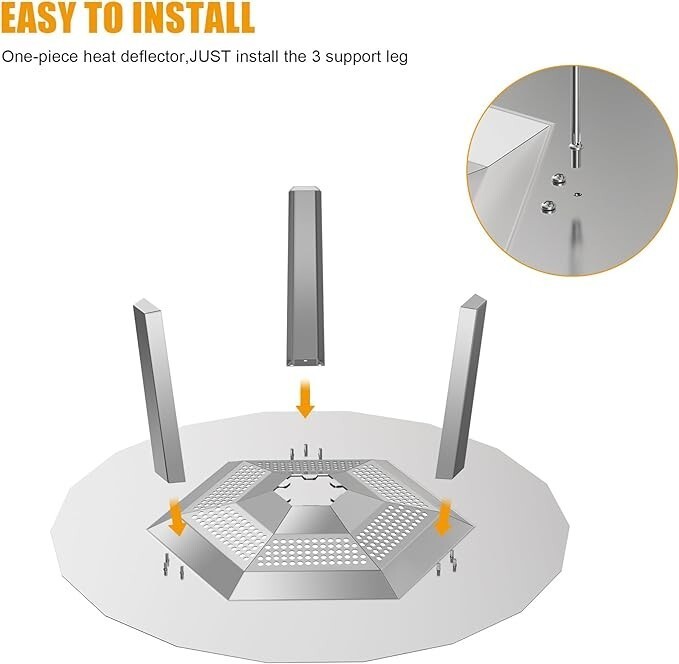 ?Easy Installation?Effortlessly install and dismantle the deflector without additional tools. The package includes a one-piece deflector, three support legs, and 2 silicone gloves for convenient moving.Easy assembly, making setup a breeze.