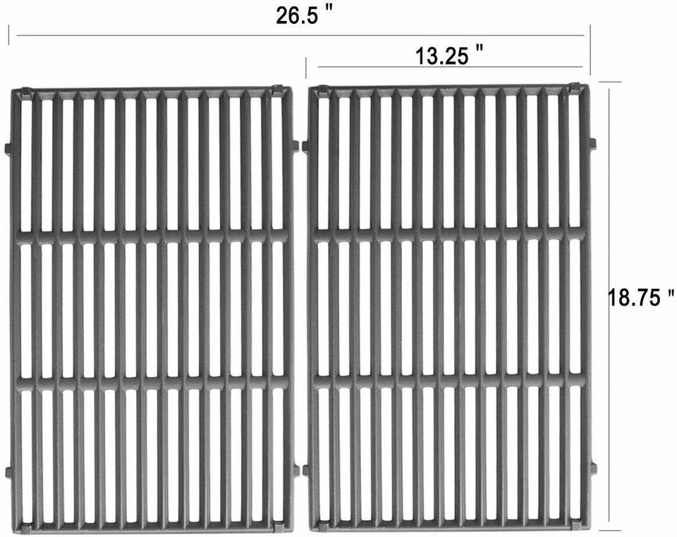 ?DIMENSION PACKAGE?18.75? x 13.25? for each grate, 18.75? x 26.5? for total. Comes with 2 cast iron cooking grates. Kindly compare with the SIZE and MODEL of your original parts before you order.