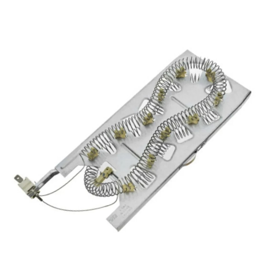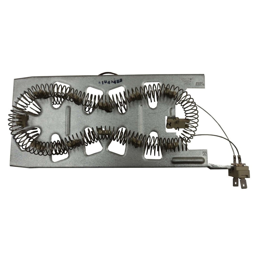 This Dryer Heating Element Assembly is an ERP replacement part that is designed to fit late-model Whirlpool, Kenmore, Estate, and Roper electric dryers. The assembly includes a metal frame, metal element coil, and ceramic coil insulators.