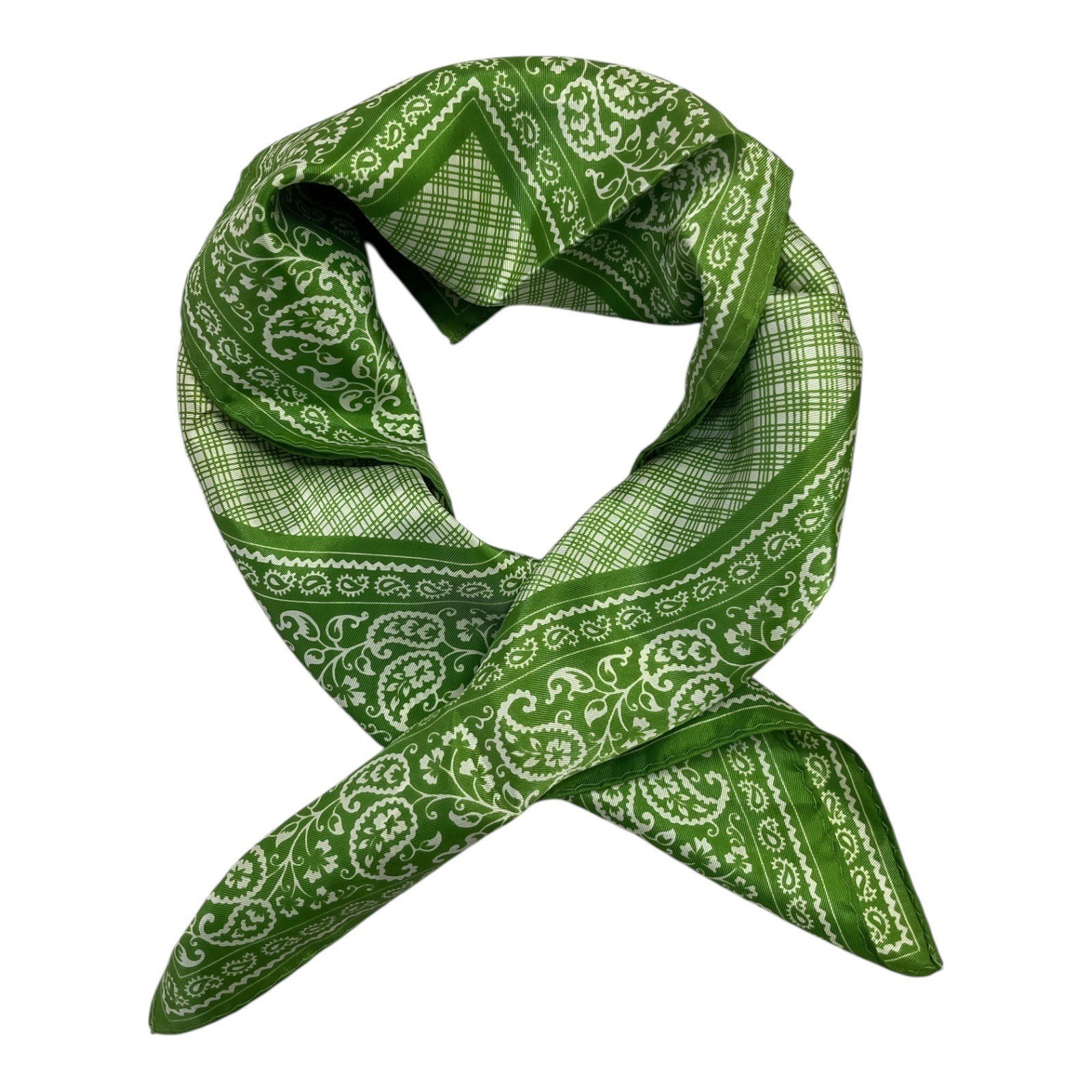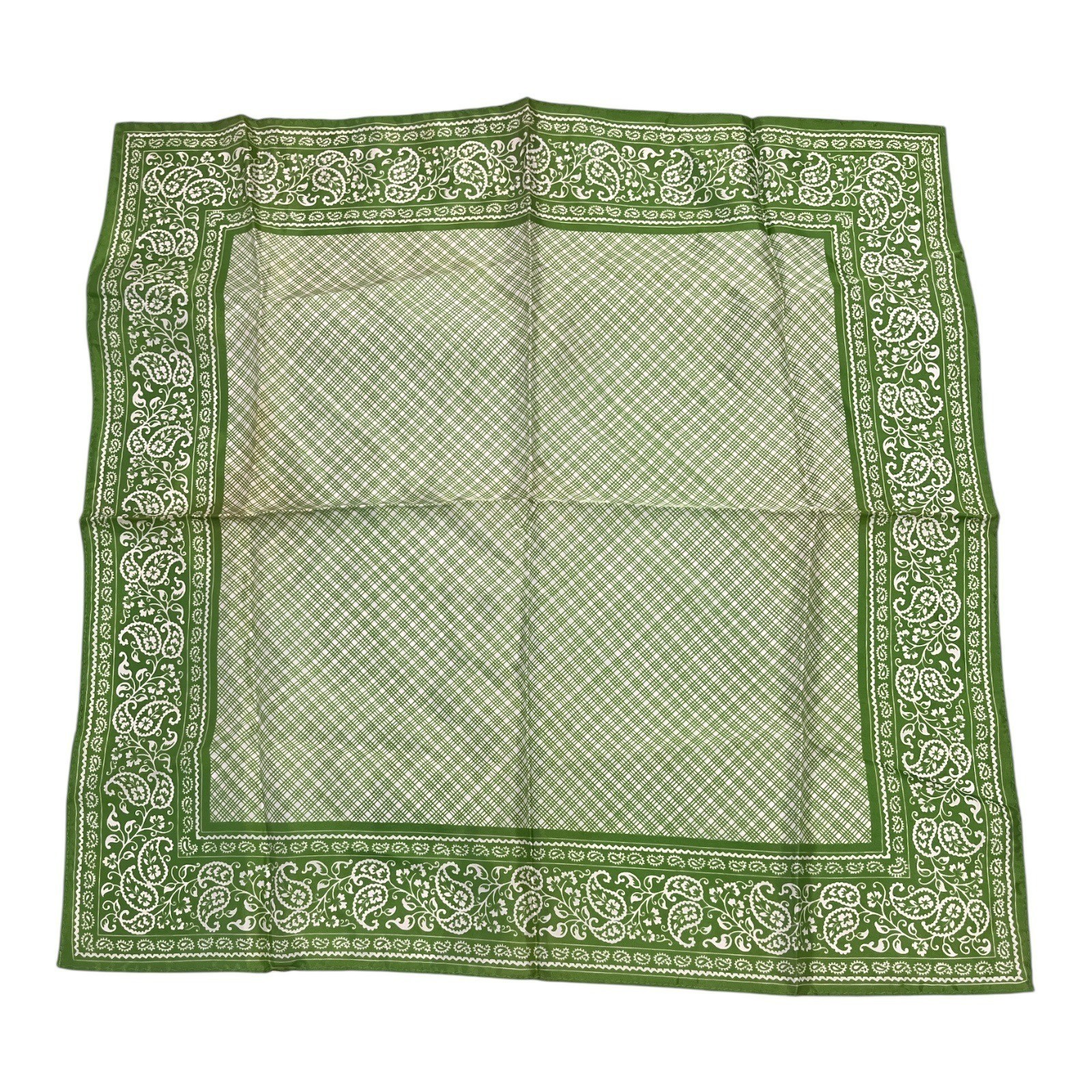 Classic vintage Glentex scarf crafted in Japan from soft acetate. Features a timeless green and white paisley border surrounding a geometric lattice center pattern. A versatile square shape perfect for wearing as a neck scarf, head wrap, or handbag accent.