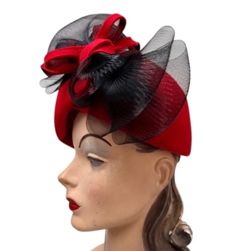 This exquisite vintage hat embodies the glamour and elegance of mid-century millinery. A fiery red wool tilt base is crowned with a sculptural black mesh and red felt ribbon flourish, creating a dramatic silhouette that channels old Hollywood sophistication. Made by Mr. John, a legendary milliner known for dressing icons of the 1940s?60s.