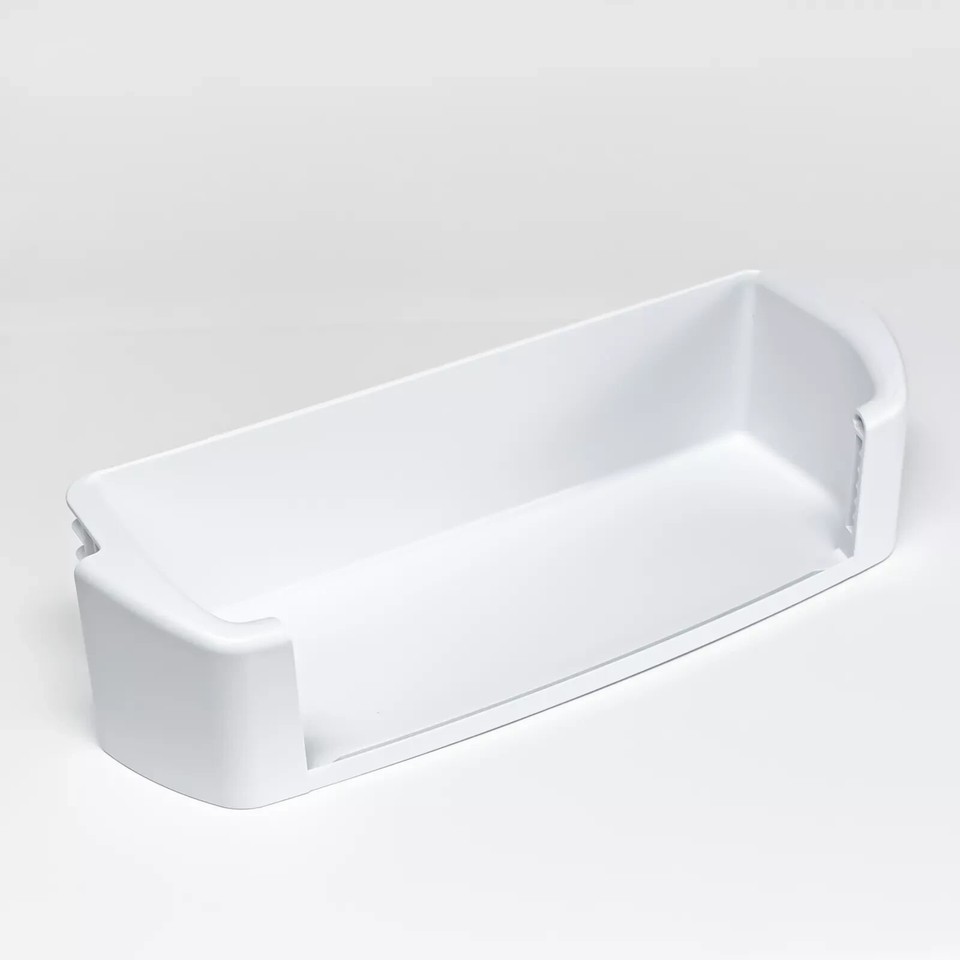 The GE door bin is an OEM replacement part responsible for providing convenient storage and organization of various items within the refrigerator's fresh food compartment. This part is located on the refrigerator door panel. It serves as a storage compartment for holding smaller food items, condiments, jars, bottles, or other frequently accessed refrigerator contents. By offering additional storage space on the refrigerator door, it helps maximize the usable storage capacity of the appliance, ensuring that commonly used items are within easy reach.