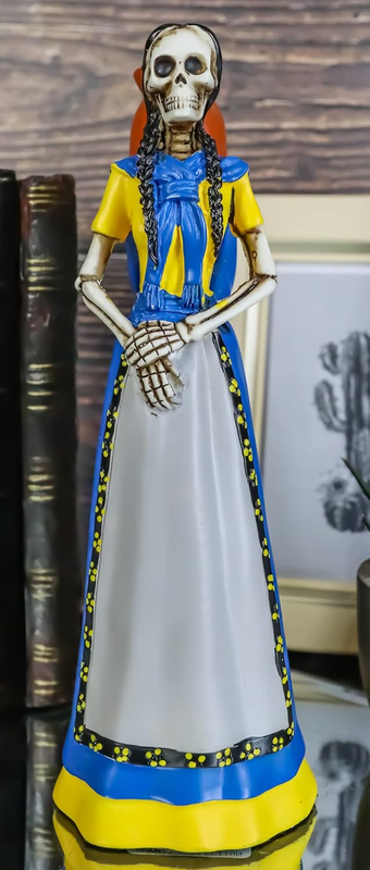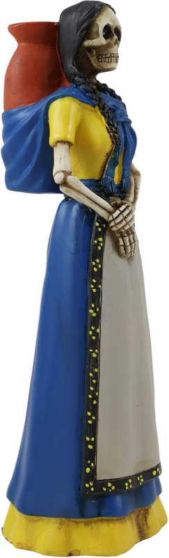 Day of the Dead or Dia de los Muertos is a Mexican holiday celebrated throughout Mexico, in particular the Central and South regions, and acknowledged around the world in other cultures. It starts on October 31st and ends on November 2nd. This Figurine depicts a Senorita in a blue and yellow dress. She is carrying a brown Jarrito Clay Pot on her back, normally filled with agua fresca. This Gothic Mexican Lady With Jarrito Pot Statue measures 7.75" tall, 2.5" long and 2.5" deep approximately. It weighs about 9 ounces.