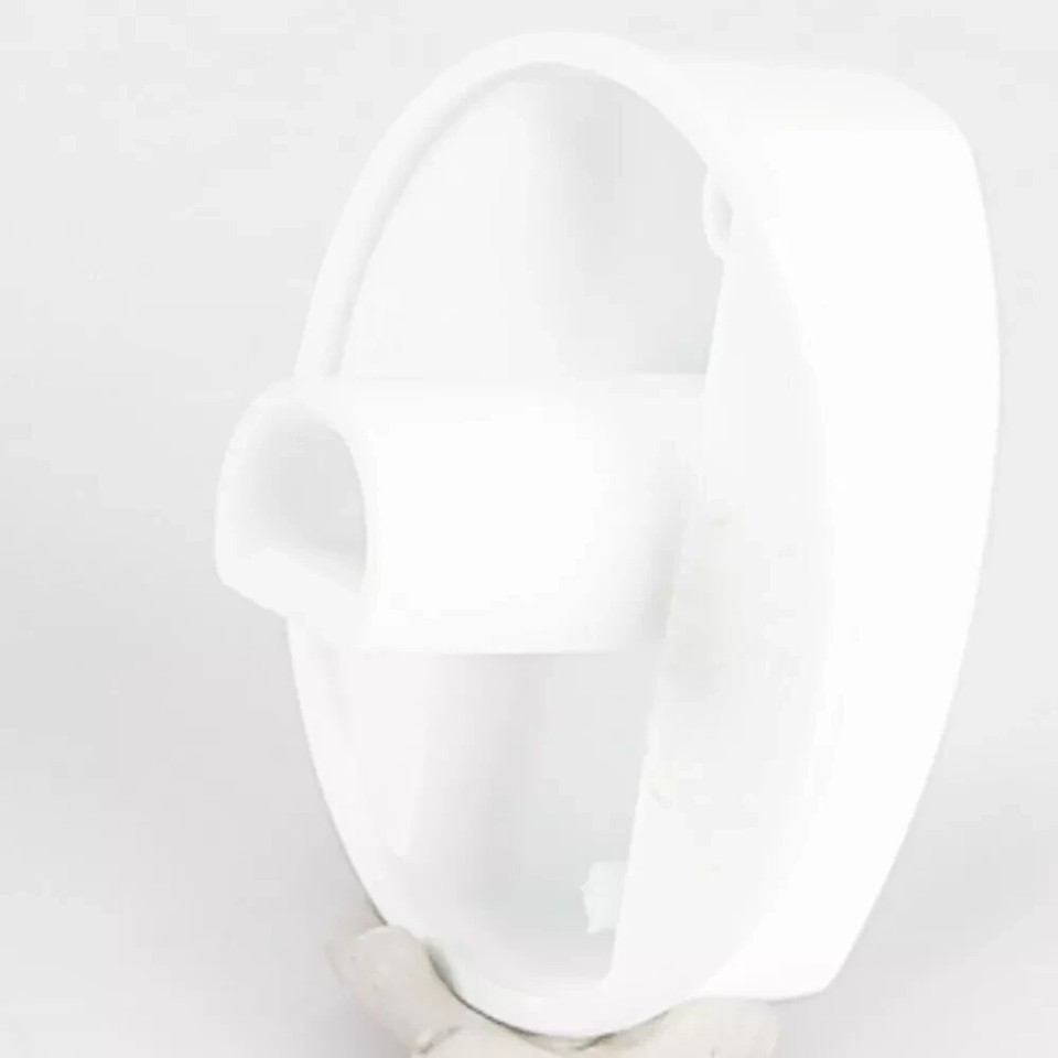 This gas valve knob is an inch and a half in diameter. It is white in color and is made entirely of plastic. This knob has a gray triangle shaped indicator, and it will accept a 'D' shaped shaft.