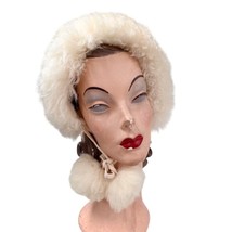 VTG Shearling Lamb Fur Bonnet Hat with Pom Pom Ties Winter White 1950s–60s Style