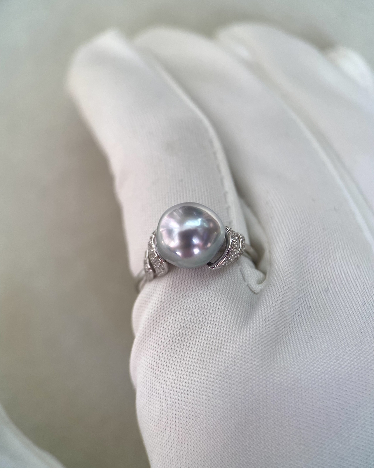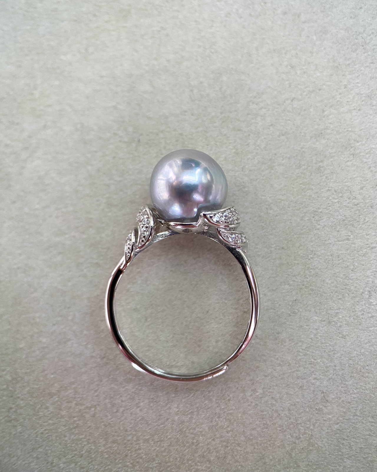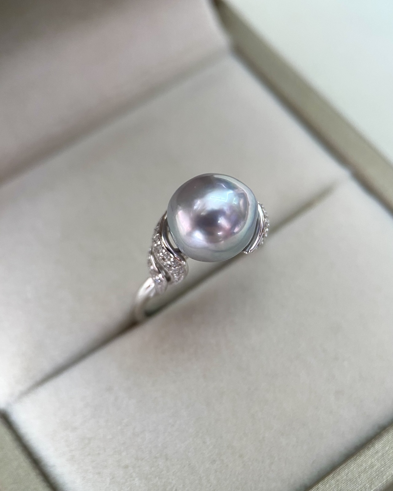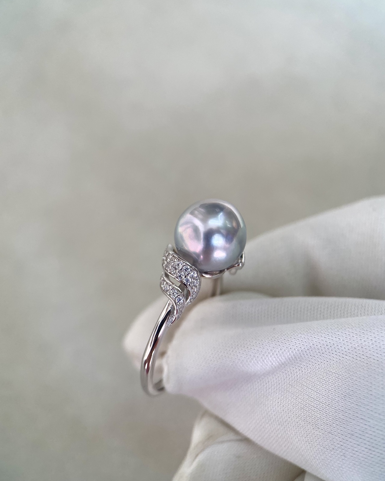Typically ranging between 6–9mm, the 9.6mm saltwater-cultured Akoya pearl showcased in this ring is a true rarity—often referred to as a “giant” among Akoya pearls. As part of the Madama Akoya silver-grey-blue series, its exceptional size and clarity elevate its uniqueness to an unparalleled level.