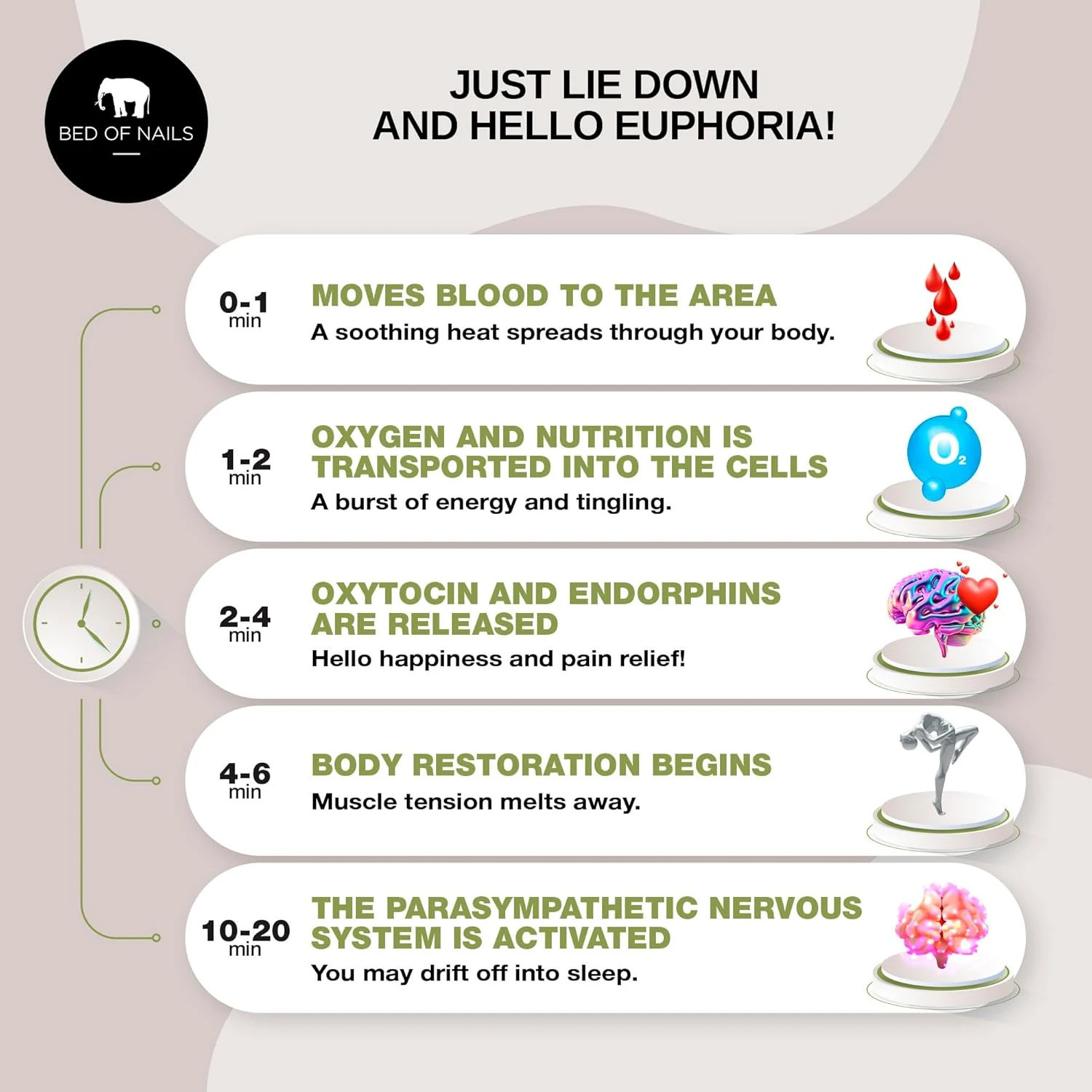 Bed of Nails (BON) brings the self-healing benefits of treatments, such as acupuncture and massage, into the homes and workplaces of people everywhere to create and sustain a healthy lifestyle amid the stresses of a modern world. The mystical bed of nails originated over 1,000 years ago and was used by gurus in the practice of meditation and healing. Bed of Nails has created a modern, ergonomically designed version of that ancient technology, with a Swedish twist, to model those same deep healing effects.With thousands of non-toxic plastic nails, harmless to the skin but with all the healing benefits of its legendary ancestor.