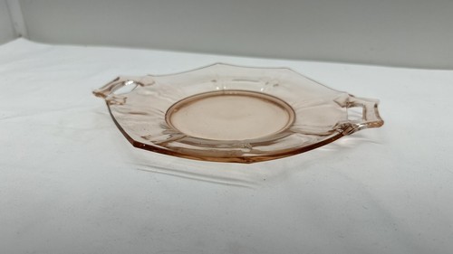 This vintage pink depression glass plate is a beautiful addition to any collection. The hexagon shape with handles makes it perfect for serving cake or sandwiches. The smooth glassmaking technique adds to the unique and elegant look.