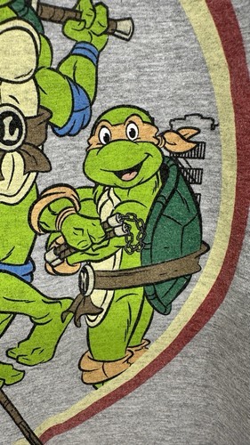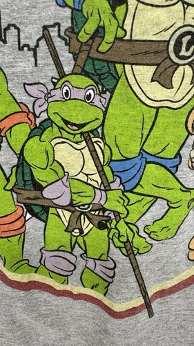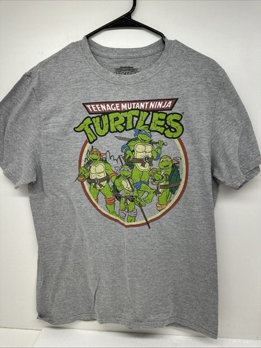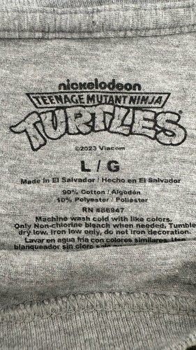 Show off your love for the Teenage Mutant Ninja Turtles with this gray short sleeve crew graphic T-shirt. The relaxed fit and knit fabric type make it comfortable to wear, while the solid pattern and cartoon theme give it a playful touch. The shirt features a graphic of the beloved ninja characters and is available in size L for men. Perfect for any fan of the TMNT, this T-shirt is a must-have addition to your wardrobe.