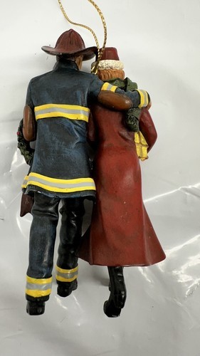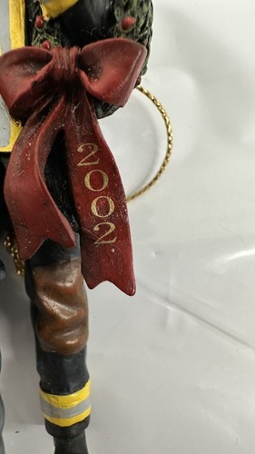 Celebrate the holidays with this special 2002 Heroes Christmas Tree Ornament featuring a firefighter snowman rescuing a dog. The ornament is made of durable resin material and depicts a heroic scene in black color. Its unique snowman shape and vintage vibe make it a perfect addition to any ornament collection.