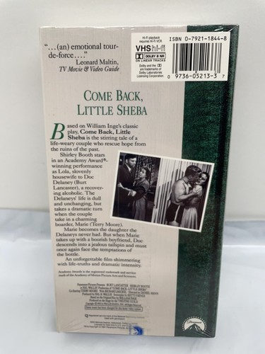 Experience the classic drama of "Come Back, Little Sheba" with this brand new and sealed VHS tape. Starring Burt Lancaster and Shirley Booth, this movie tells a heartwarming story that will surely captivate you. The film is in the English language and follows the NTSC signal standard. It is rated NR and is not a former rental.