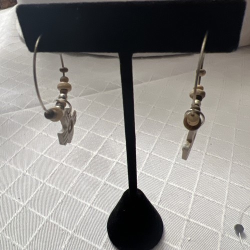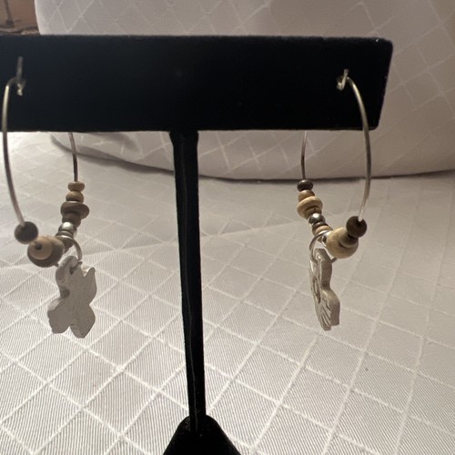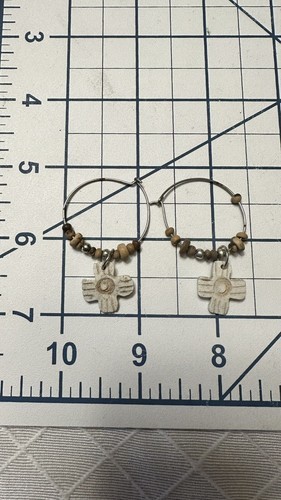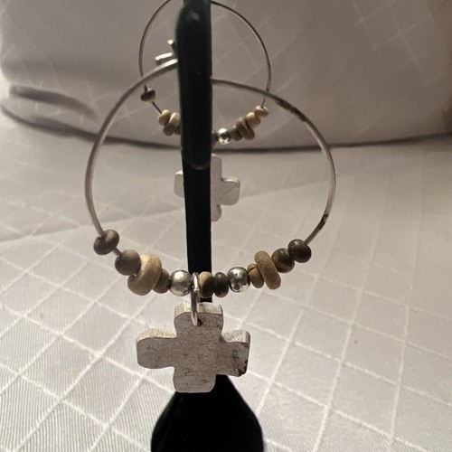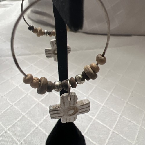 Handmade Wood Cross Beaded Drop Silver Tone Hoop Earrings Mod Boho Chic