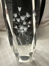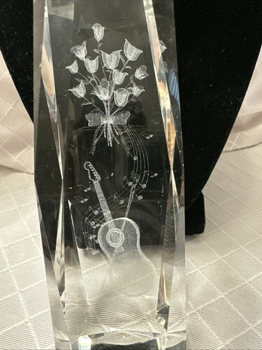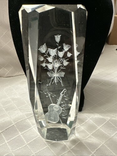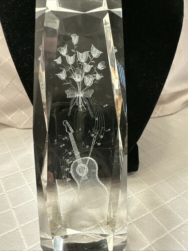 This 3D Laser Etched Crystal Art Glass Paperweight features a beautiful bouquet of roses with a guitar design. The clear crystal material showcases intricate etched patterns of the flowers and guitar, creating a contemporary and elegant style. This original piece is unmarked and is likely studio crafted, making it a unique and artistic addition to any space.