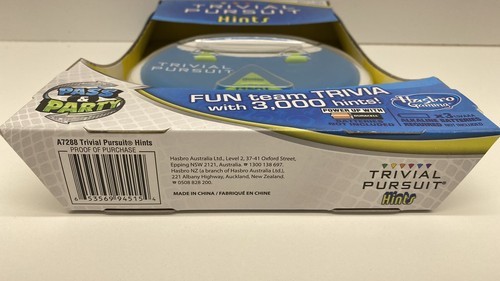 The Hasbro Trivial Pursuit "Hints" gaming machine is an electronic accessory for the Trivial Pursuit game, released in 2013. Designed for ages 12-16 years, this gaming machine adds a new dimension to the traditional Trivial Pursuit experience with electronic features. It belongs to the character family of games and is manufactured by Hasbro. The product is still new in its original packaging, making it a desirable item for fans of Trivial Pursuit looking to enhance their gameplay.