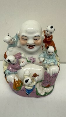 The Laughing Buddha figurine stands at 6.5 inches tall, made of porcelain in a Chinese style. This collectible sculpture features the iconic Laughing Buddha subject, adding a touch of serenity and joy to any space. Perfect for adding a unique decorative accent to your home or personal collection, this figurine captures the essence of Chinese culture and tradition.