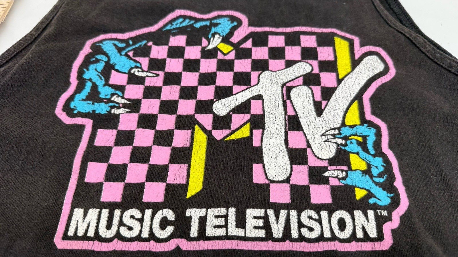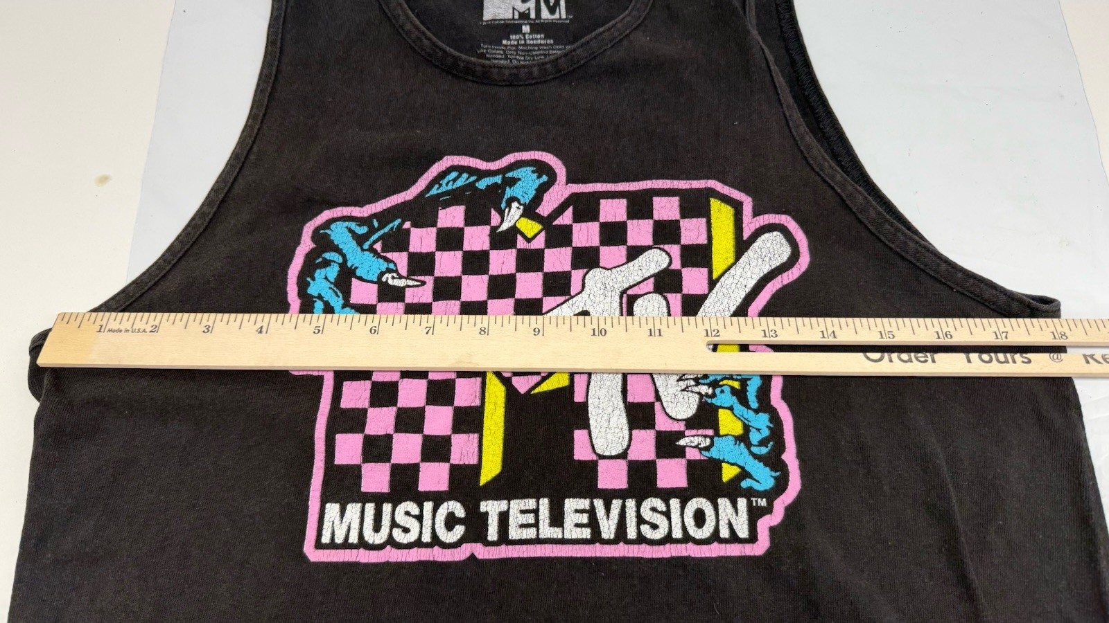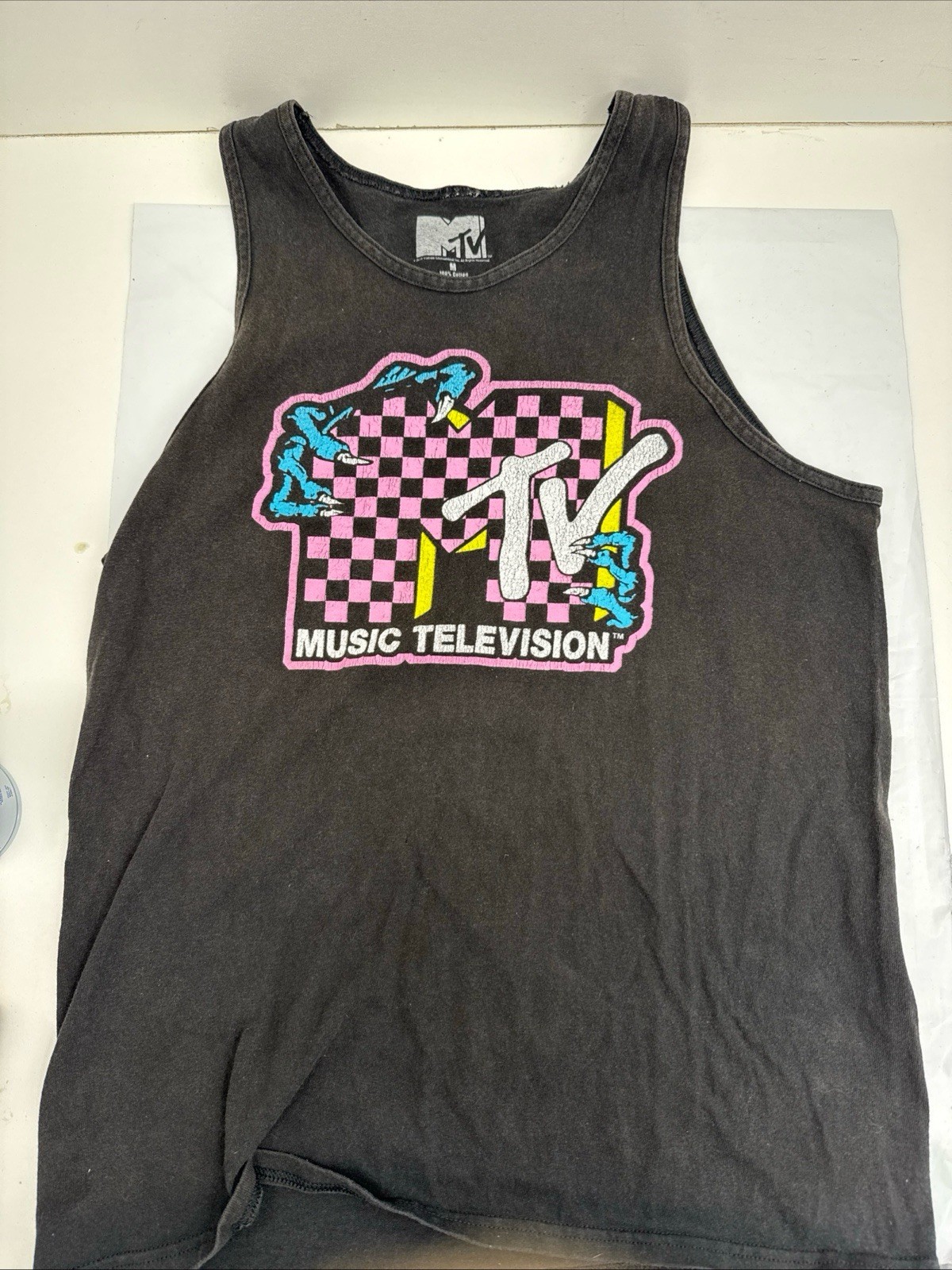 The logo is cracking so it has character! The product is a men's medium size black tank top with the MTV logo on it. It is a regular fit t-shirt designed for men, featuring a classic black color and the iconic MTV branding. Perfect for casual wear, this tank top is a stylish and comfortable addition to any wardrobe, ideal for fans of the music channel or those looking for a trendy and versatile top.