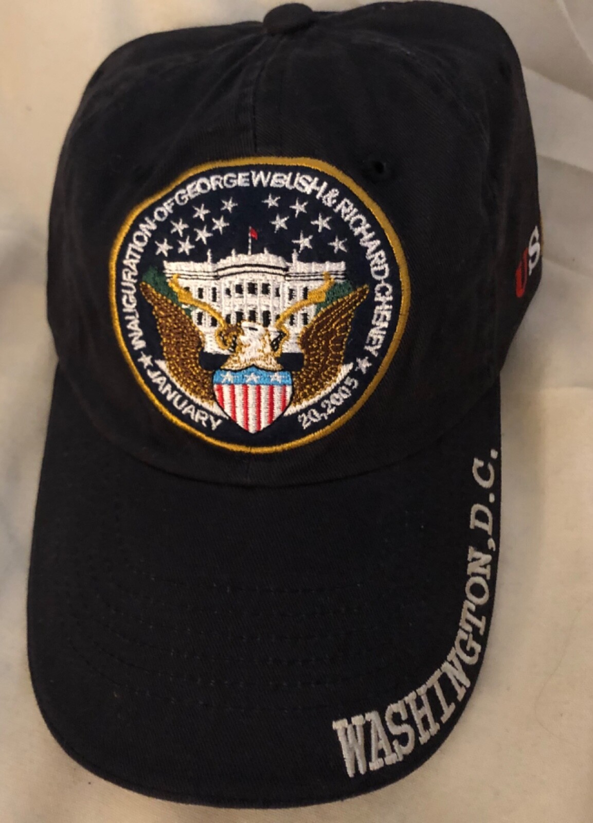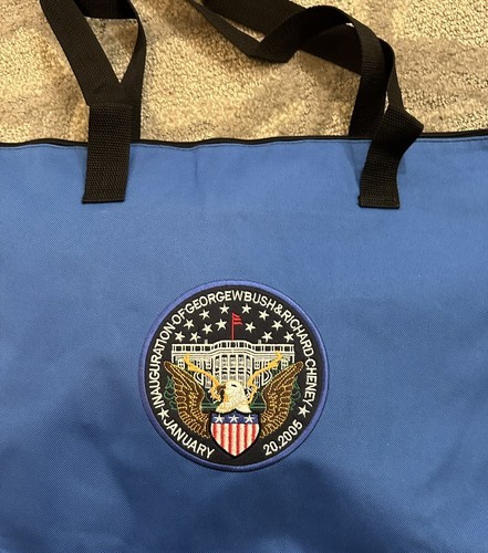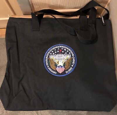 INAUGURATION of GEORGE W. BUSH RICHARD CHENEY JANUARY 20, 2005 LARGE BLACK TOTE CARRY ALL BAG?GOOD QUALITY HEAVY CANVAS LIKE FABRIC BAG MEASURES 18? x 15? WITH 1 1/4? WIDE HANDLE CARRY STRAPS. FRONT HAS CENTER EMBROIDERED AREA WITH BACKGROUND OF PRESIDENTIAL EAGLE SEAL IN FRONT OF THE WHITE HOUSE. HAS INSIDE POCKET ZIPPER CLOSING TERRIFIC COLLECTIBLE ITEM FROM OUR 43rd PRESIDENT?S INAUGURATION.. LAST 12 PHOTOS SHOW OTHER ITEMS NOW LISTED FOR INDIVIDUAL PURCHASE . .