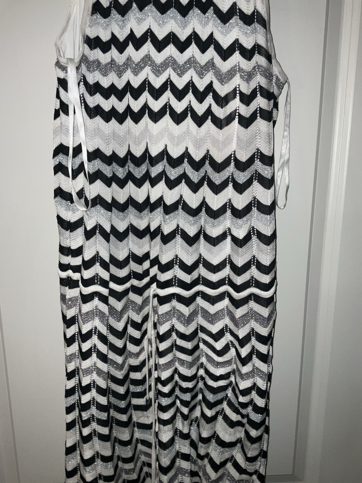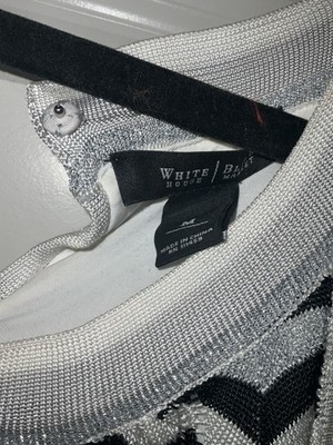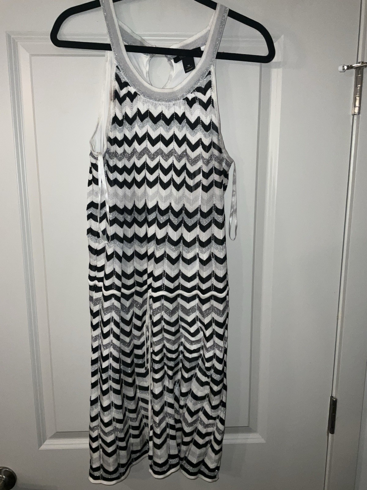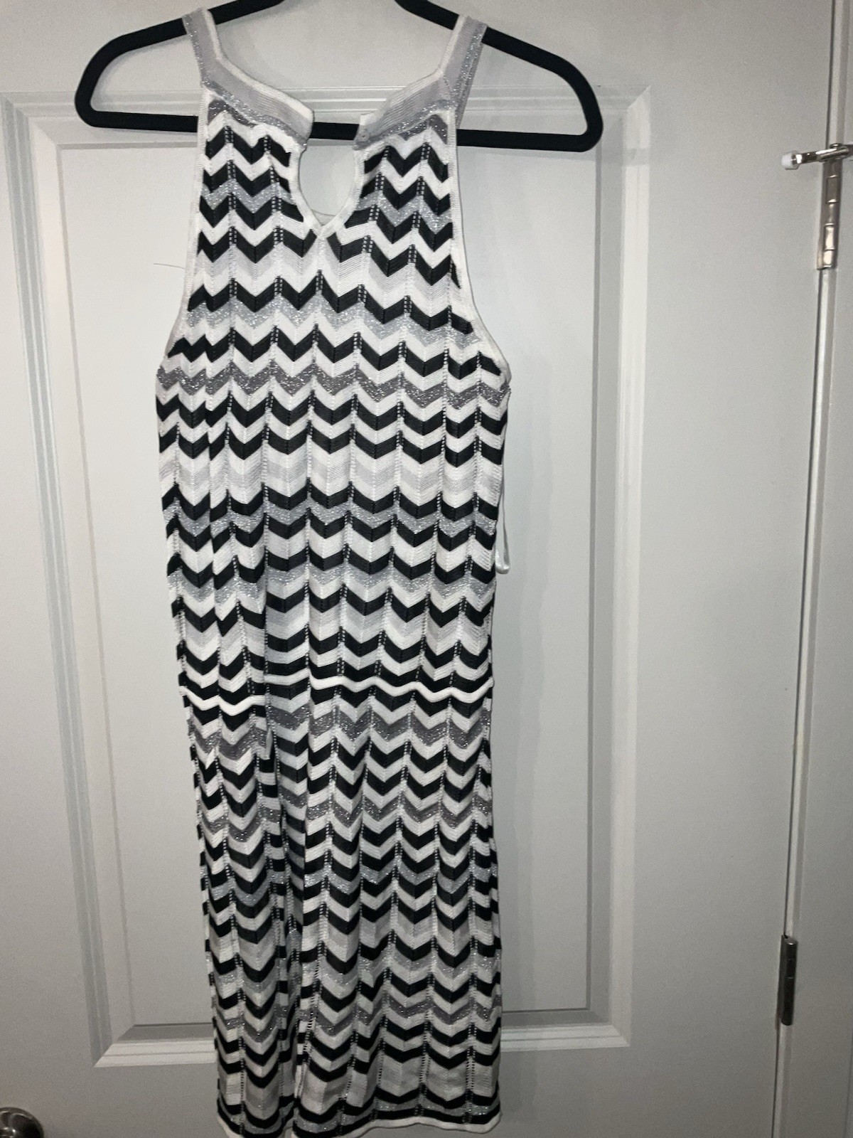 The White House Black Market Chevron Print Sleeveless Dress in size Medium is a stylish and versatile bodycon dress perfect for women. The dress features a flattering black, white, and silver chevron pattern with a sleeveless design, making it a chic choice for a variety of occasions. With a length of 40 inches, this dress is sure to make a statement in any wardrobe, offering a fashionable and timeless style for the modern woman.