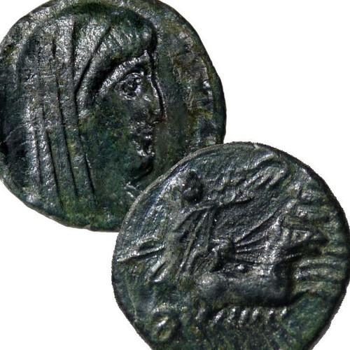This remarkable coin depicts Constantine the Great being flown up to heaven in a chariot pulled by four horses (Quadriga)