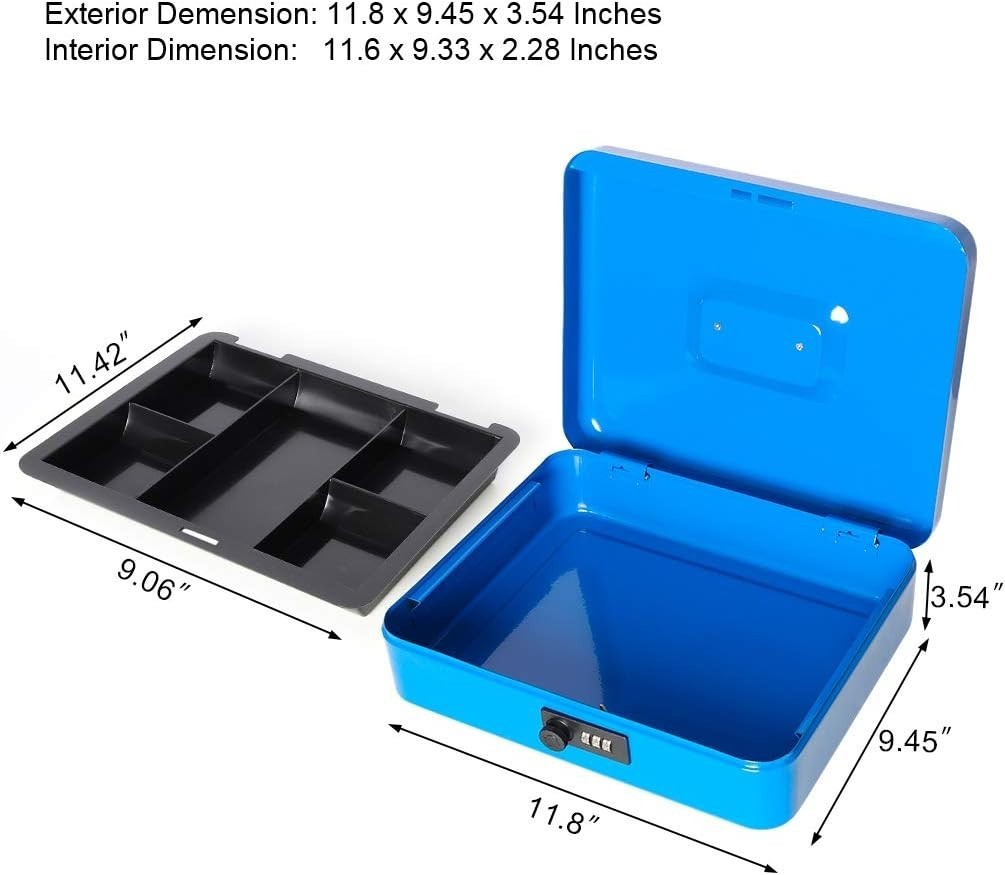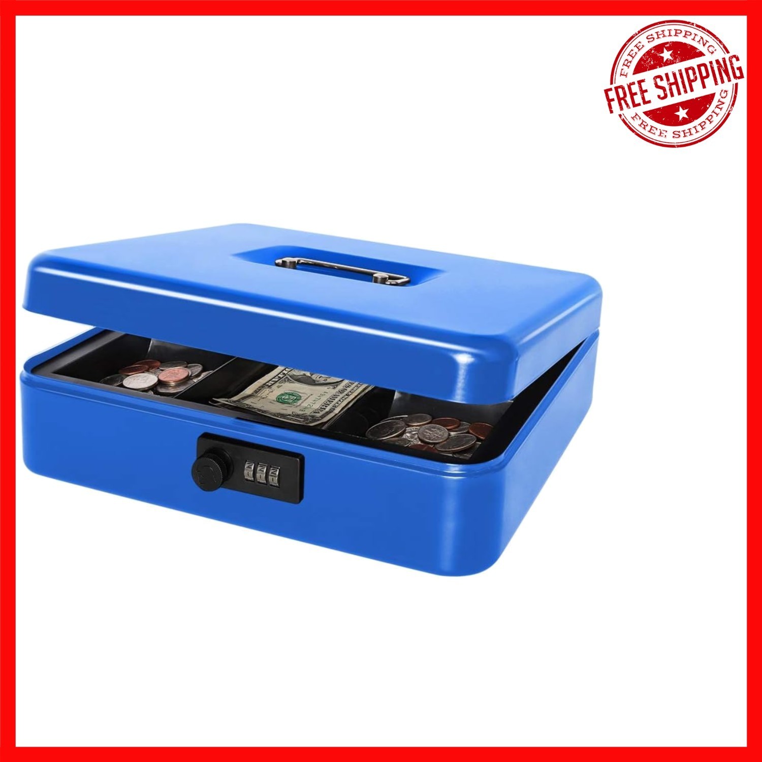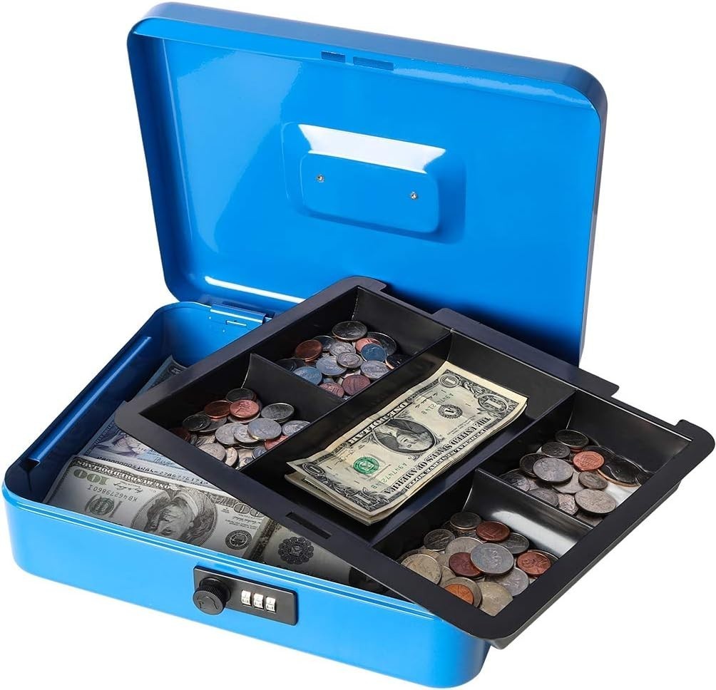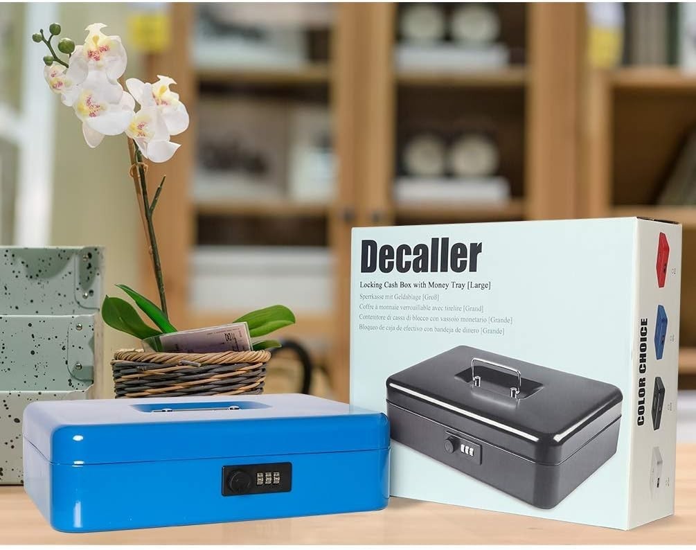 The DECALLER Cash Box is a durable and secure storage solution featuring an advanced combination lock, crafted from resilient steel material that outperforms plastic in flexibility and durability. Its removable money tray, equipped with five compartments, helps organize coins, keys, and jewelry, while the spacious bottom compartment accommodates checks, receipts, and valuables. Designed for portability, it includes a sturdy, curved-handle for easy carrying. Measuring 11.8 x 9.45 x 3.54 inches, this versatile lock box is ideal for indoor and outdoor use at festivals, supermarkets, fundraisers, schools, storage lockers, and yard sales. Trust in DECALLER?s 21 of experience for a reliable, long-lasting product.
