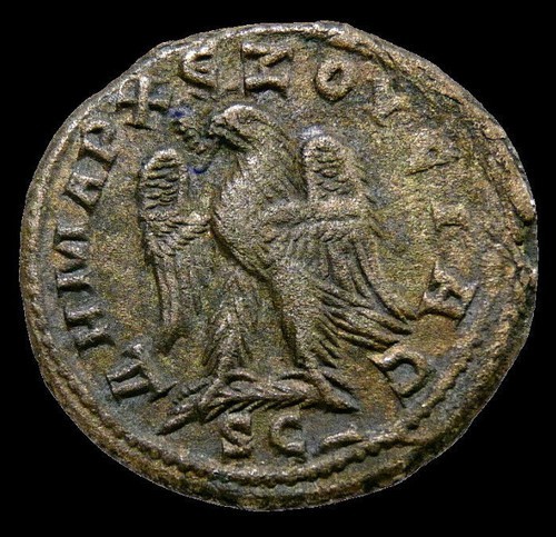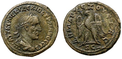 Reverse: ?HMAPX E?OYCIAC, eagle standing left on palm frond, head left, with wings spread, holding wreath in beak, SC in exergue.