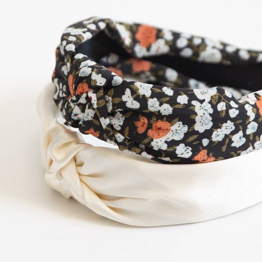 This is the cutest 2 pack set. One darling floral headband, and a solid sateen headband. They make the perfect add on accessory to your wardrobe. Pep up that cute white t-shirt and jeans with these adorable headbands. Keep it so simple with your accessories and let the headbands do the talking. This set is sold with 2 pieces.