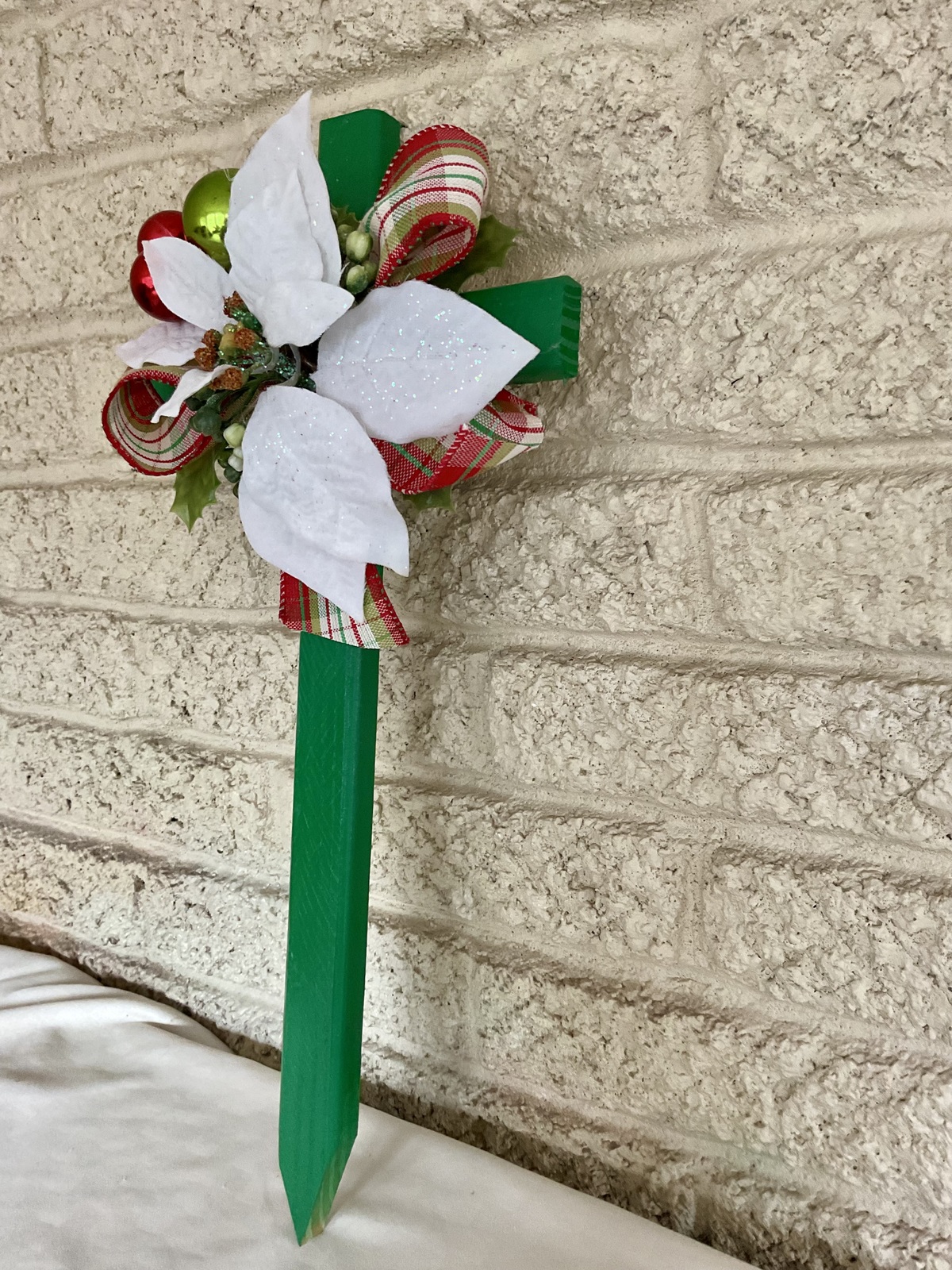 Honor your loved one this holiday season with a timeless tribute that shines with warmth and grace. This 18-inch handcrafted pine cemetery cross is lovingly painted Christmas tree green, creating a radiant backdrop for its festive floral design.