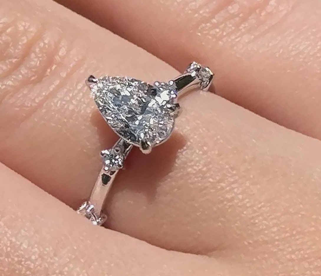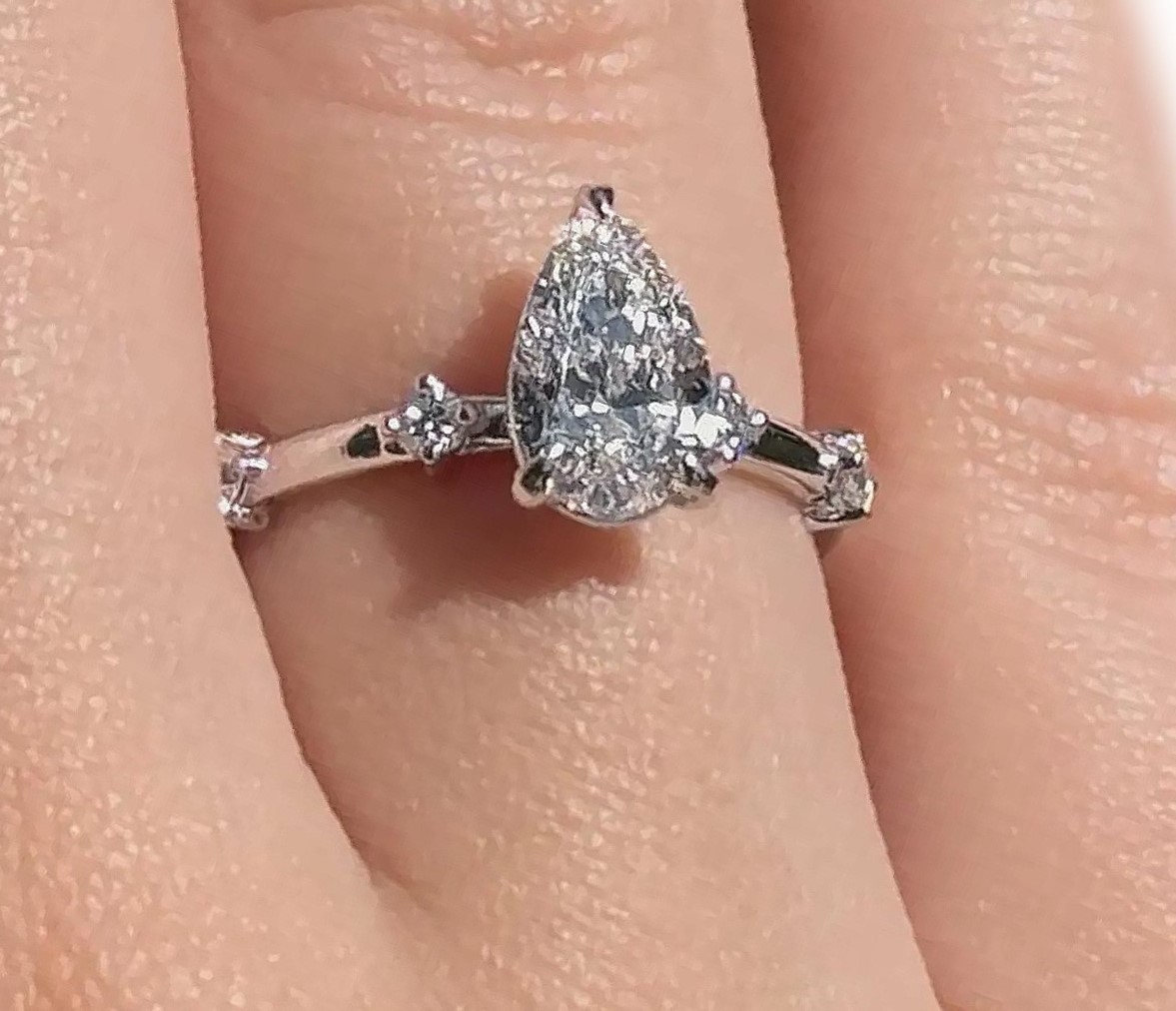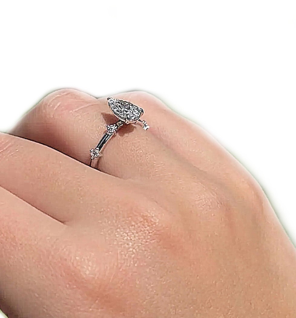 Center Stone: The centerpiece is a pear shape diamond, known for its exceptional sparkle and durability. Diamond is a lab-created that rivals diamonds in brilliance and hardness, making it an excellent choice for an engagement ring.