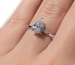 This exquisite solitaire engagement ring features a stunning 1.5ct. Pear cut Lab grown diamond VVS1 clarity and F color,9.87 - 6.39 x 4.03 MMat the center, following 4 round diamonds two on each side 0.12cttw. prong set, meticulously crafted to capture the brilliance and fire of a natural diamond. Set in luxurious 14K white gold, this ring offers a timeless elegance that is perfect for celebrating your love.