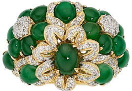 Questo anello con motivo floreale presenta cabochon di giada giadeite di forma ovale che misurano da 7 x 5 mm a 5 x 3 mm