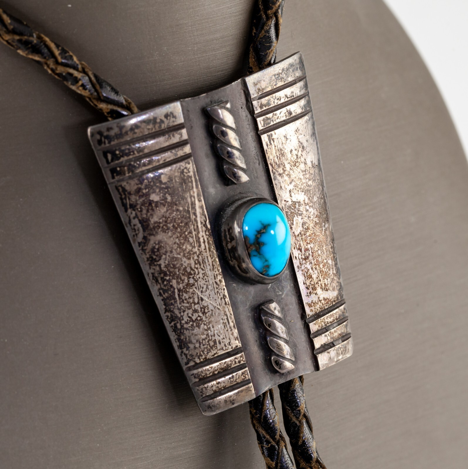 Argento Sterling Trapezoidale Placca Turchese Bolo Cravatta Con Intreccio Pelle