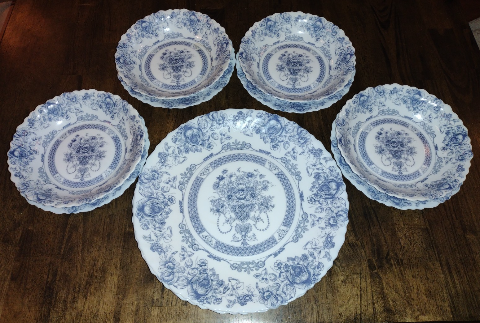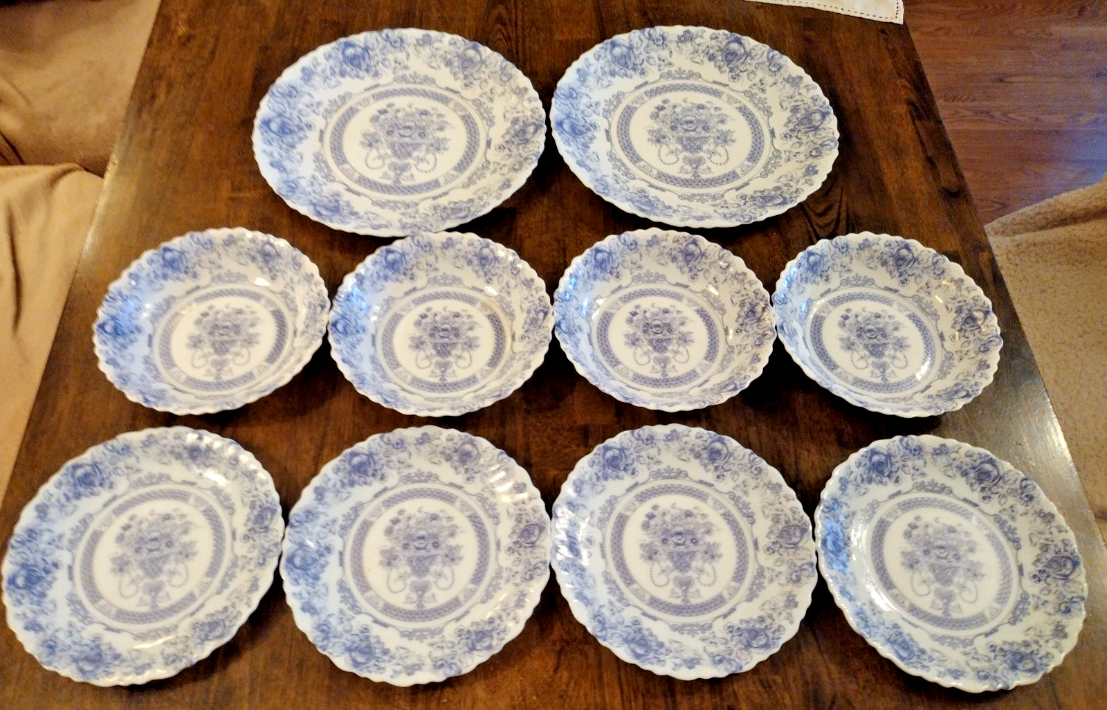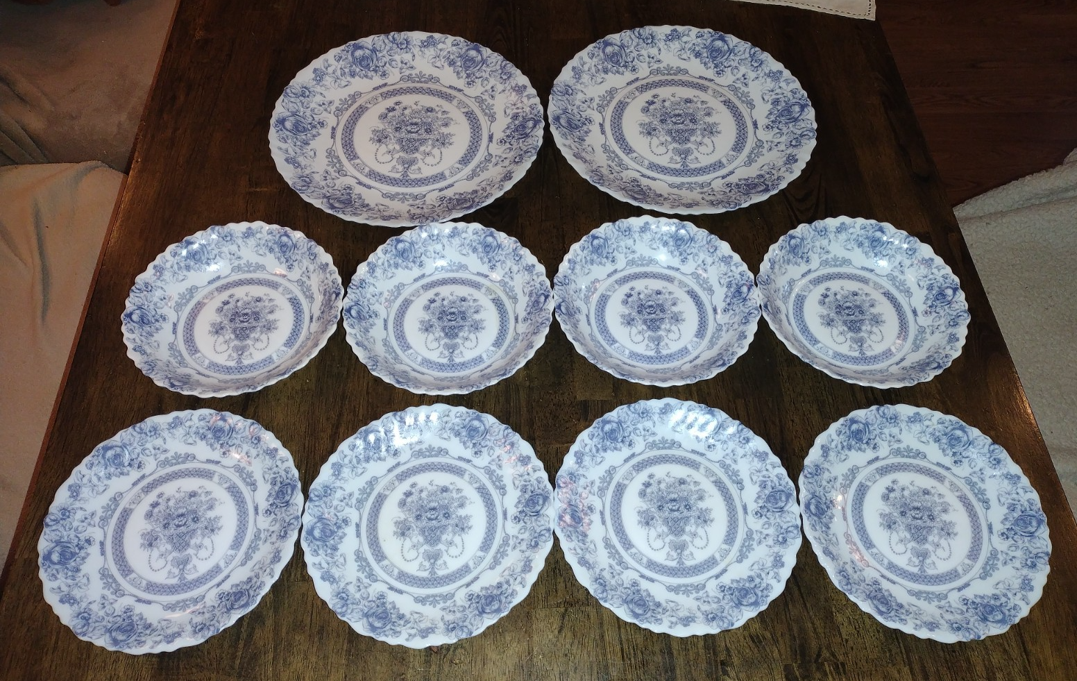 Pre-Owned ARCOPAL HONORINE BLUE FLORAL SCALLOP EDGE 10 PC PLATE BOWL SAUCER SET FRANCE. You get 2 dinner plates, 4 desert plates and 4 cereal/soup/salad bowls. They all come in excellent pre-owned condition with no chips, cracks or repairs. Ships insured.