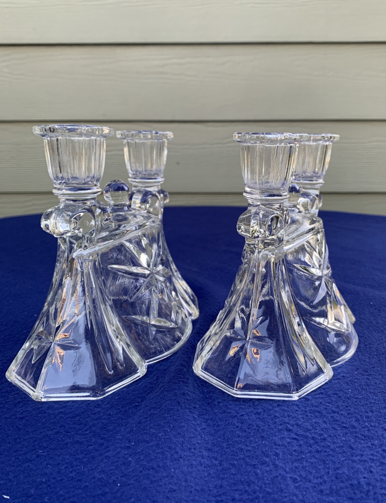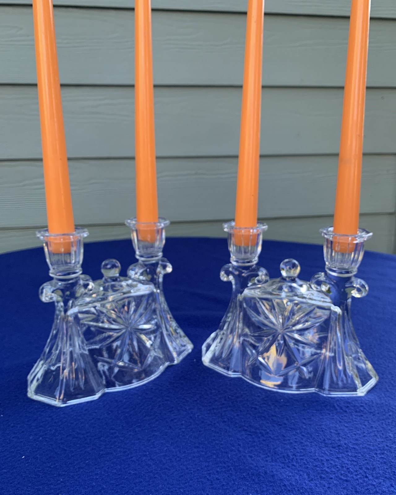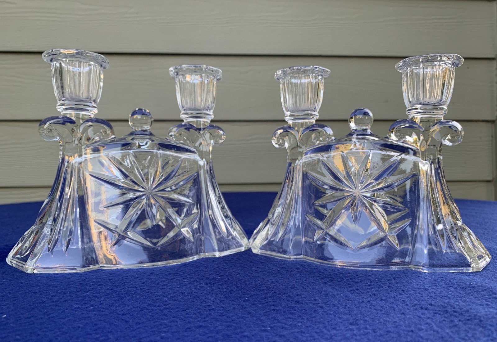 A pair of Anchor Hocking double candleholders in the popular EAPC Early American Prescut Star of David pattern, 5 3/4" tall, 7 " wide and 4" deep; no chips, scratches or sickness