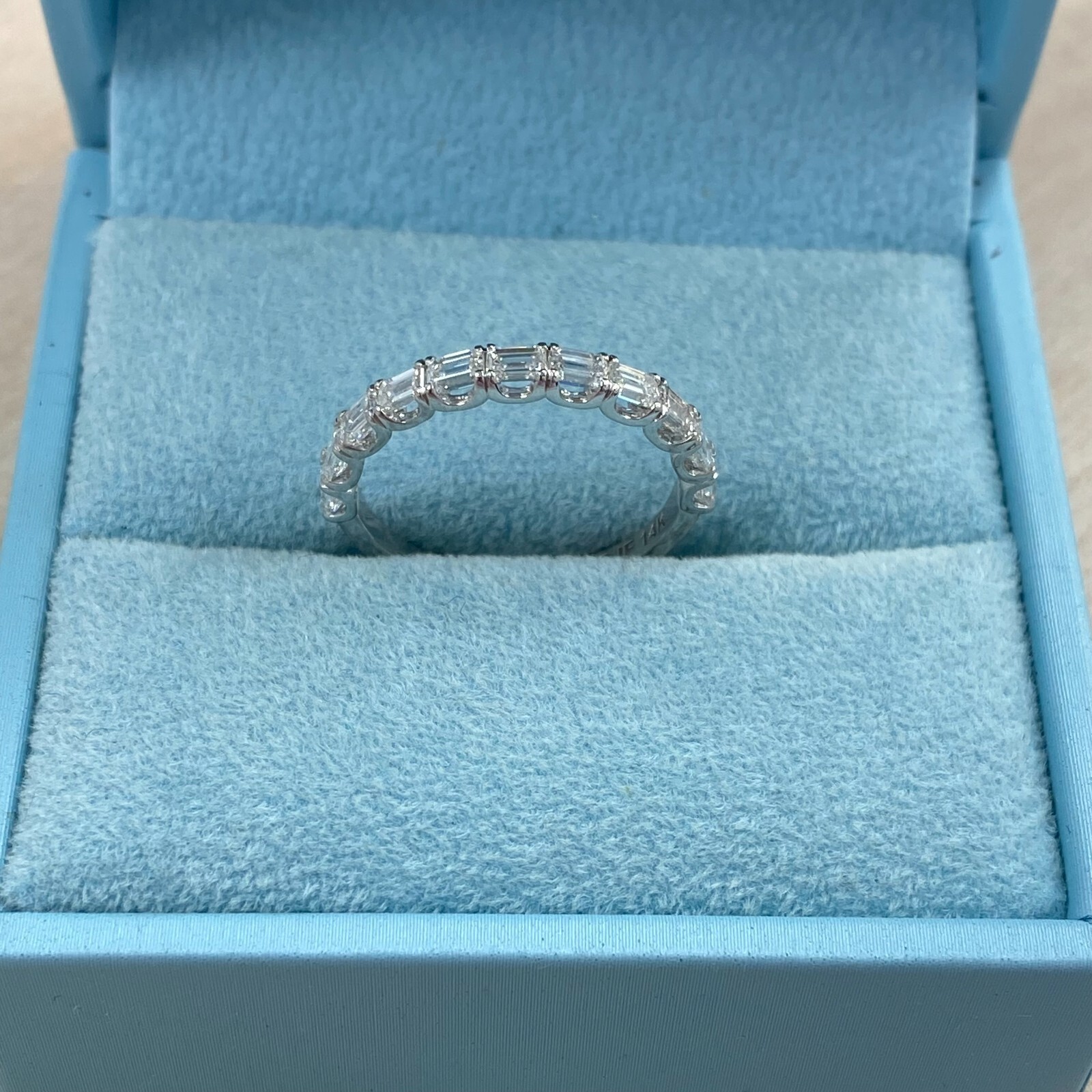 A modern twist on a classic style, this half eternity wedding band features 1 carat total of east-west set emerald-cut lab grown diamonds. Crafted in your choice of 14k white or yellow gold, it?s the perfect symbol of timeless love?ideal as a wedding band, anniversary ring, or stacked statement piece.