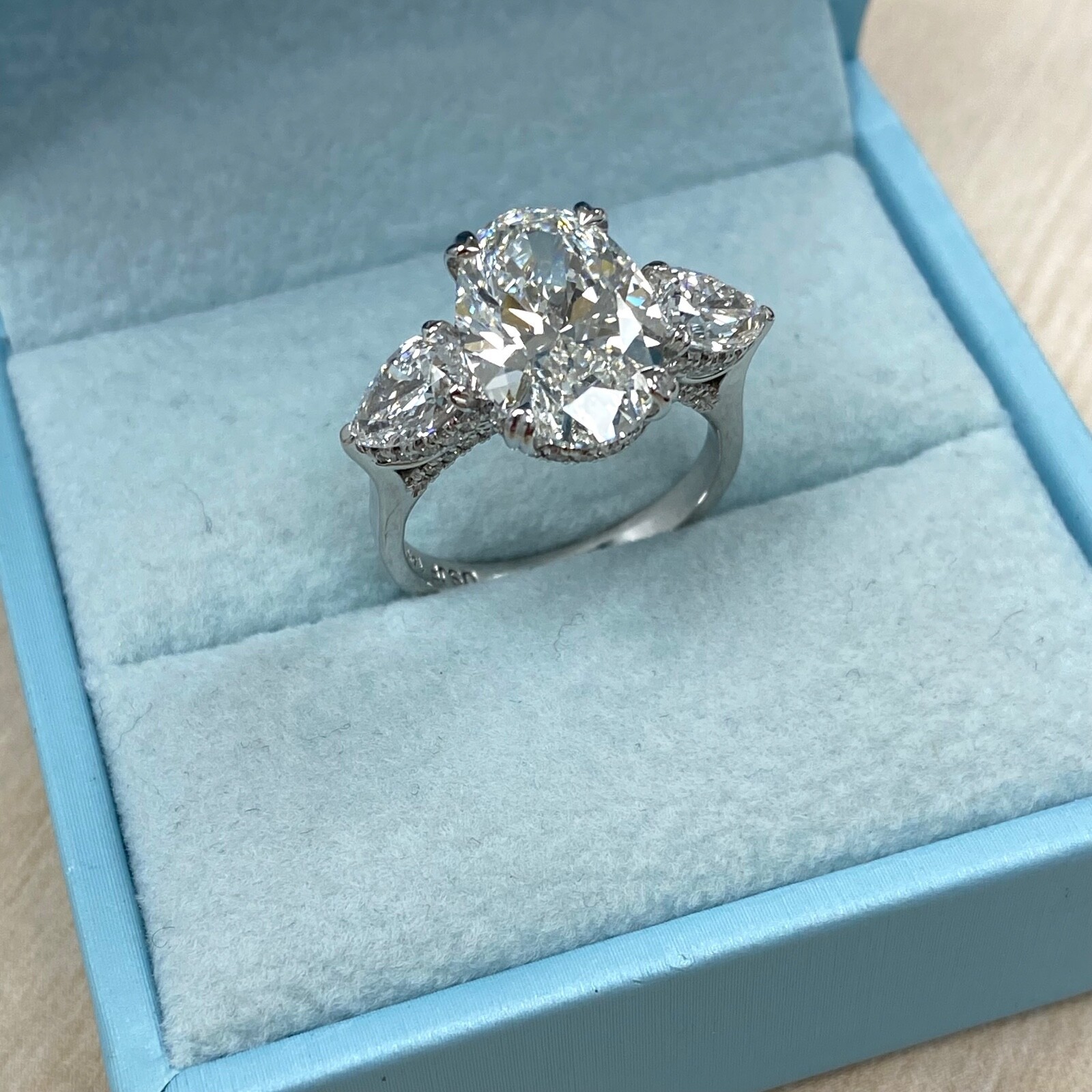 Crafted in 14k white gold, this ring showcases a captivating 4.50 carat IGI certified lab-grown oval brilliant cut diamond at its center, flanked by elegant pear brilliant cut lab grown diamonds on each side. Enveloping the ensemble is a delicate of shimmering round brilliant cut lab grown diamonds, adding an extra touch of brilliance to this piece. The ring comes with International Gemological Institute Certificate (IGI) Number: LG615347029. The total carat weight is 6.51 carats. Our products are all hand made with quality and care, in the heart of the diamond district on 47th Street in New York City. Our dedication and commitment to fine work and quality exceeds all others. Since all of our products are handmade in the USA, every piece shares the same level of attention to detail ensuri